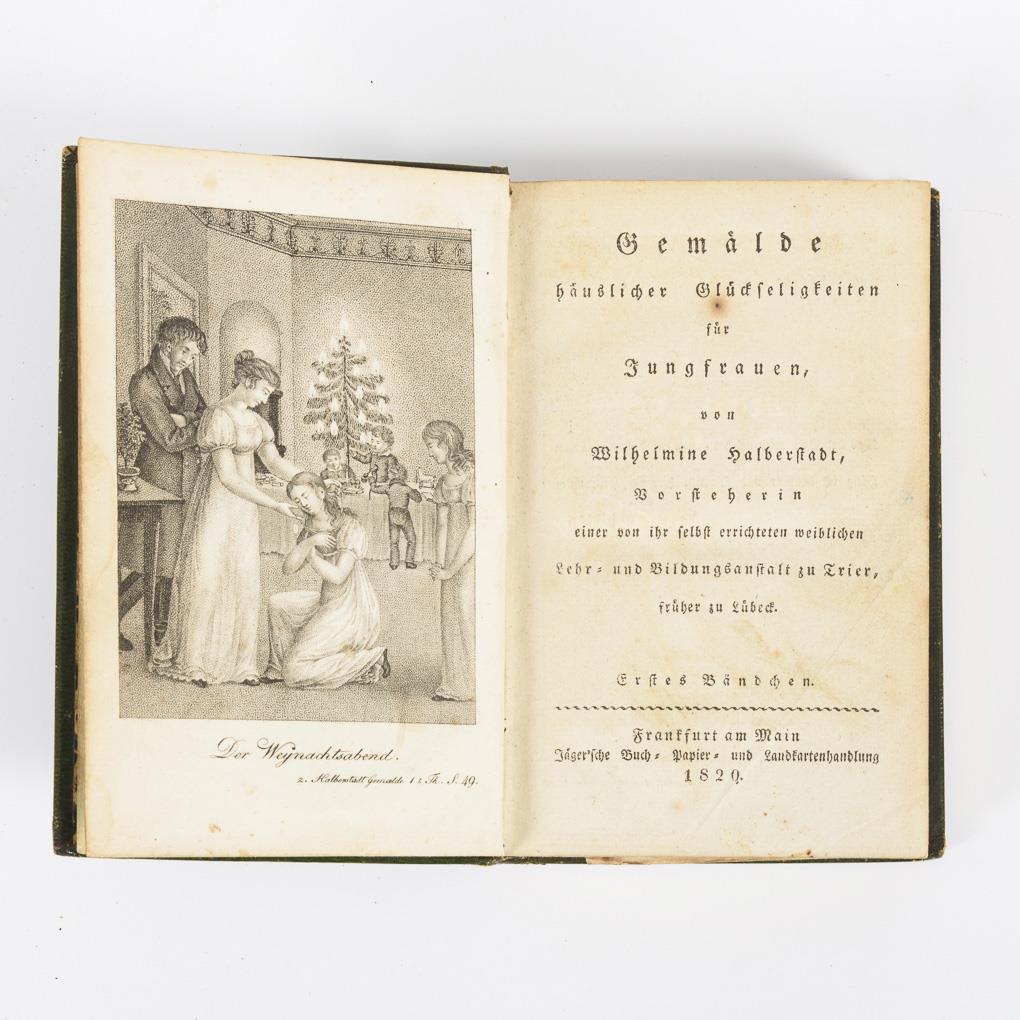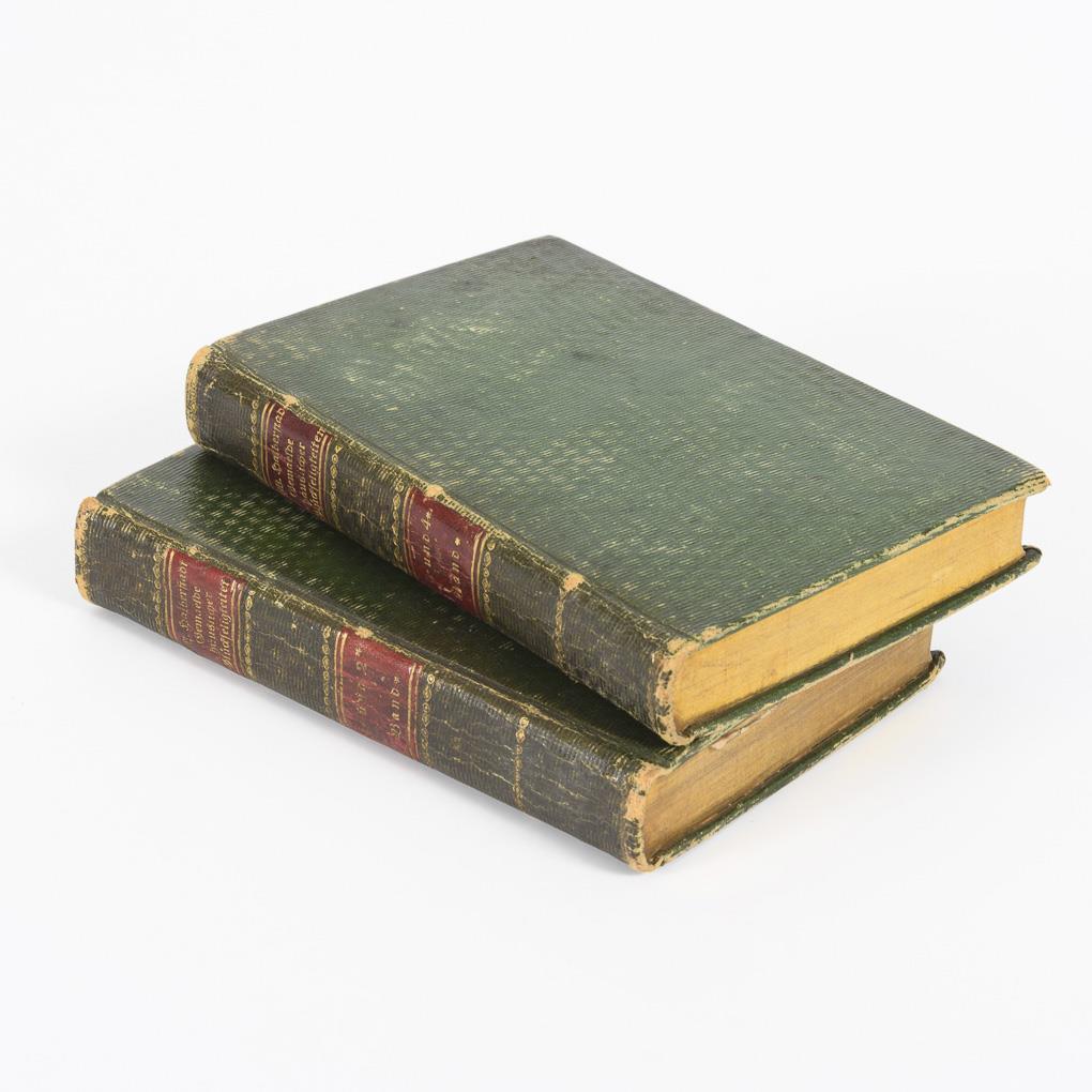 4 Bände in 2 Büchern. Kupferstich, Titel, 22, 135, 31/ 8, 231 Seiten / Kupferstich, Titel, 32, 172 / 187 Seiten. Mit Rezepten, Lehrbeispielen, Spielanleitungen u.a. Grüner Einband der Zeit mit Goldschnitt. Äußerst selten komplett im Handel erhältlich.