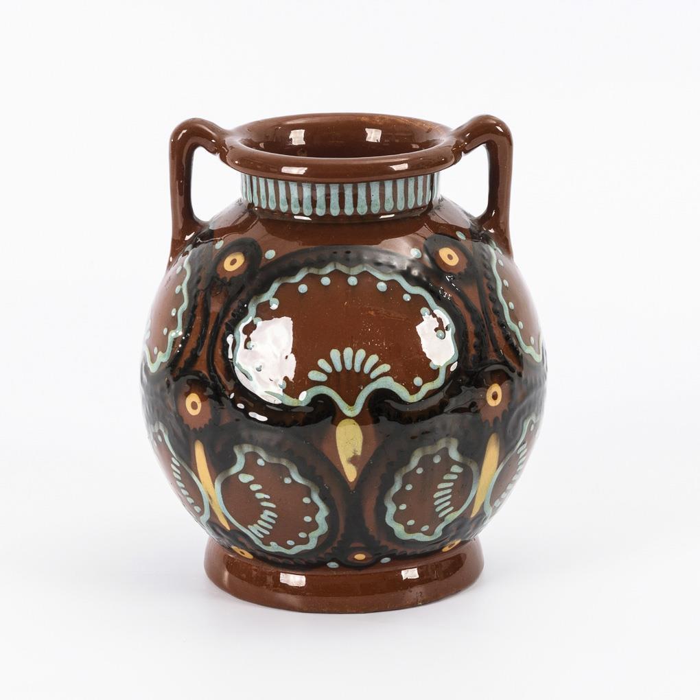 Roter Scherben, rotbraune Engobe, farbige Schlickermalerei, farblose Bleiglasur. H 20,5 cm.