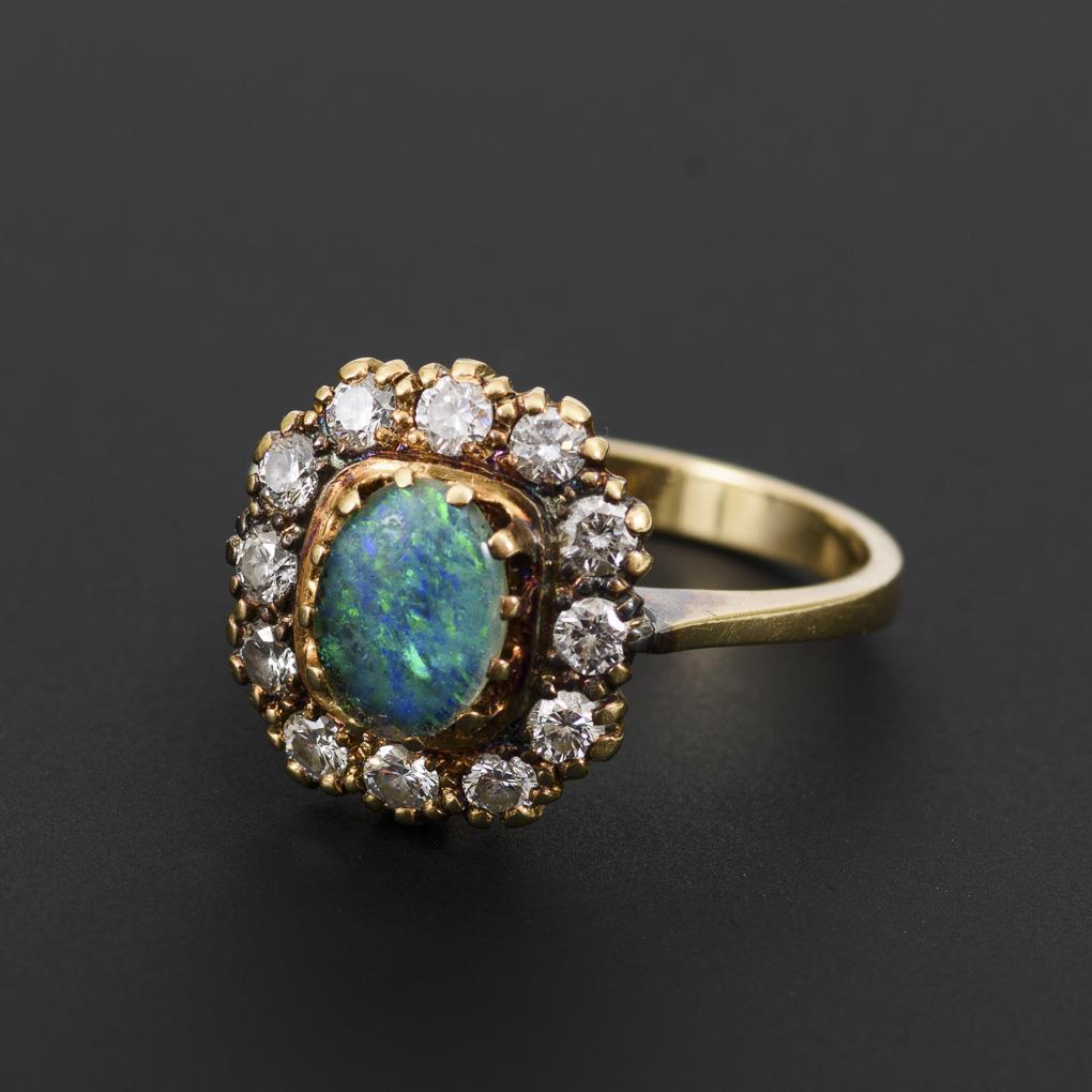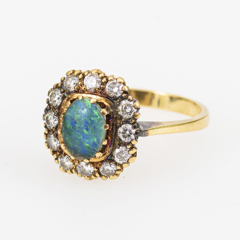 Krappengefasste Opaltriplette, umringt von 12 Brillanten. Schmale Schiene. Cabochon partiell berieben.