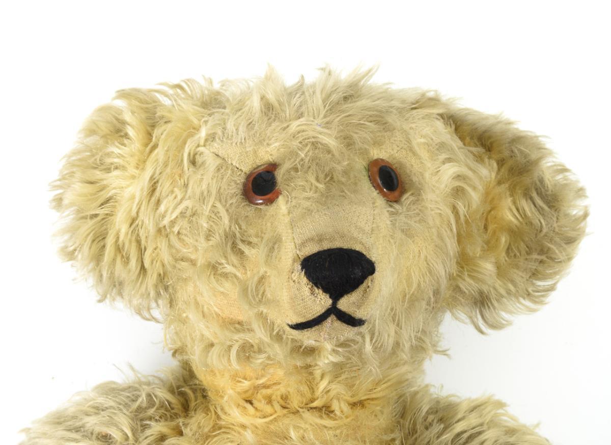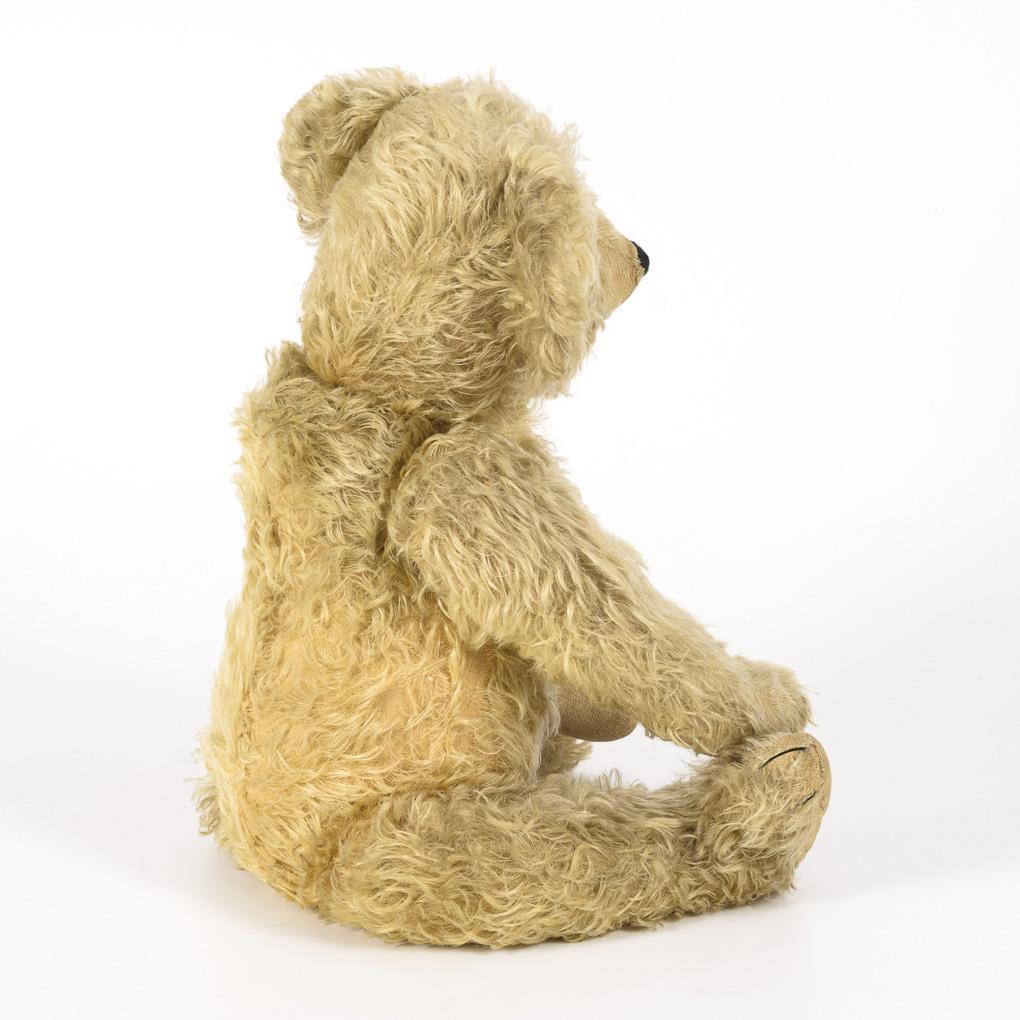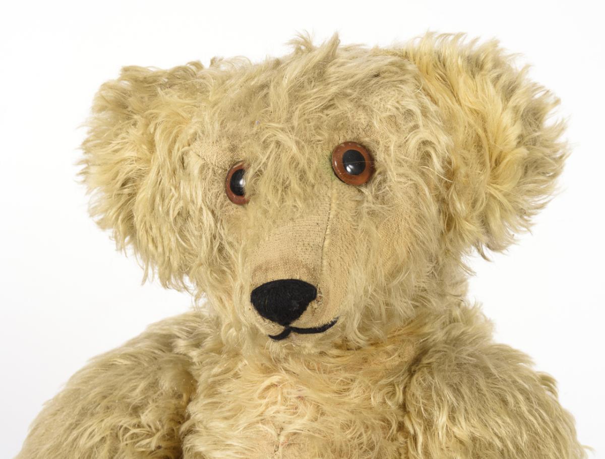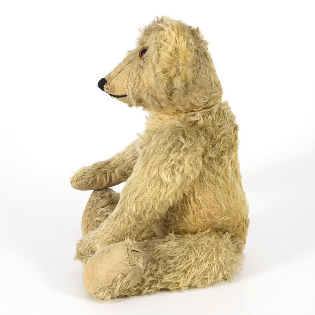 Teddybär mit spitzer Nase, seitlich angesetzten Ohren und zotteligem Fell. Mit Spieluhr als Druckstimme. Partiell abgeliebt.
