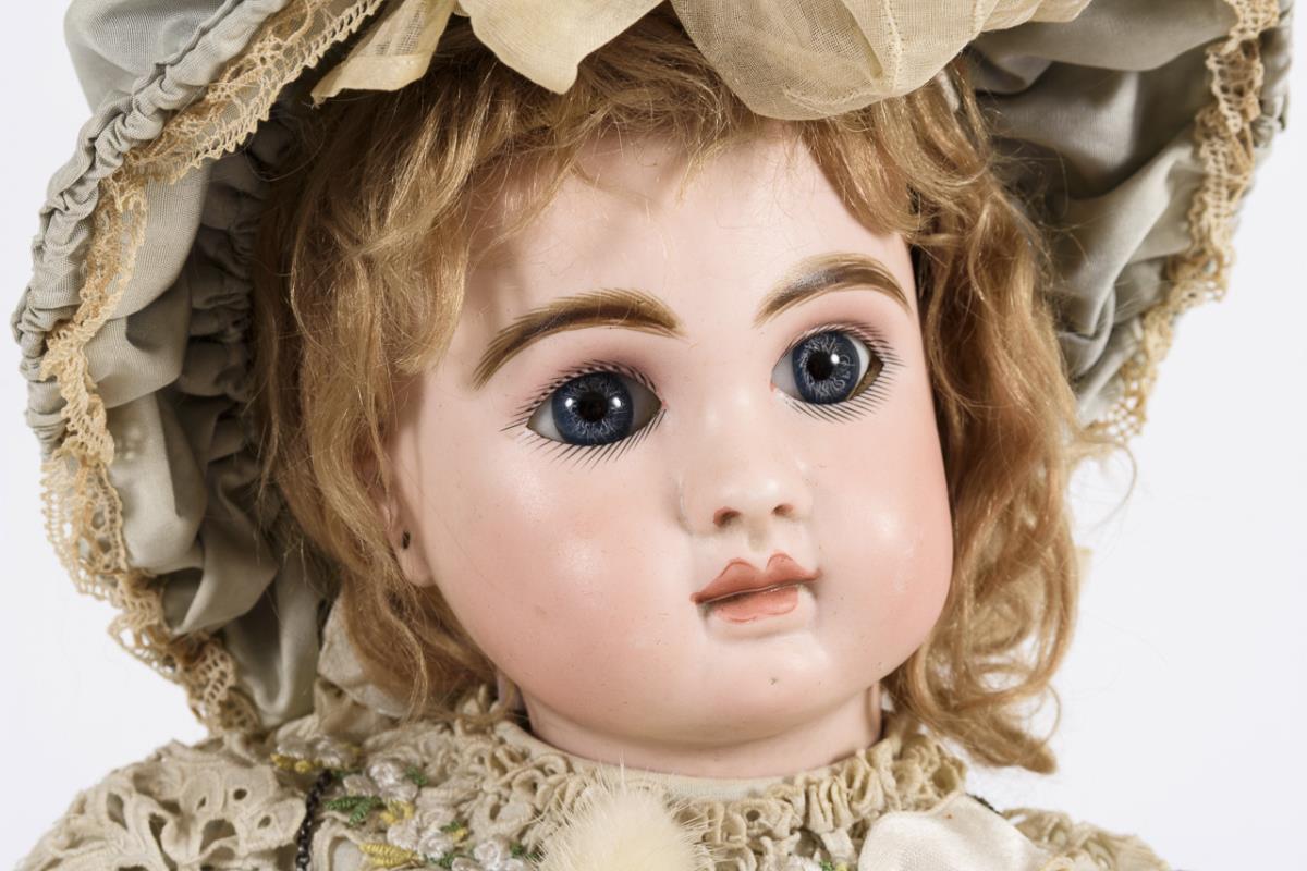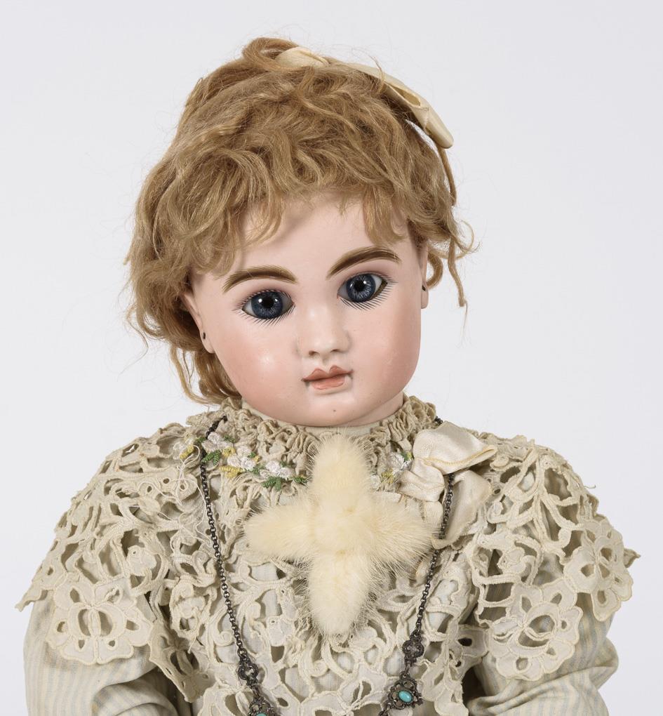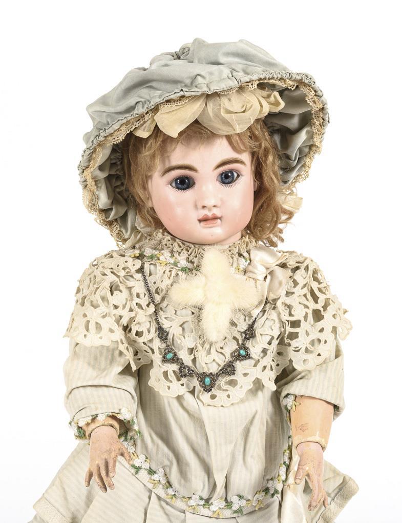 Kurbelkopf, feste blaue Paperweight-Augen, geschlossener Mund, Ohrlöcher, blonde Mohairperücke. 11-teiliger Gliederkörper mit Originaletikett "Le Petit Parisien J. Steiner, Medaille d'Or 1889". Verblasstes blau-weiß gestreiftes Kleid, blaue Haube, schwarze Wachstuchschuhe. Haarriss über rechter Schläfe und Wange, kurzer Haarriss an der Kopfkrone. Finger und Zehen mit Reparaturspuren.