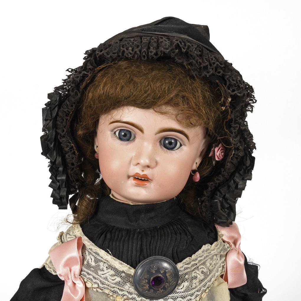 Kurbelkopf, blaue Schlafaugen, Zahnreihe, Ohrringe, braune Echthaarperücke. 11-teiliger Gliederkörper. Schwarzes Kleid, passende Haube, weiße Schürze, jünger ergänzte Lederschuhe. Einige kleine Chips und 2 kurze Haarrisse am Kopffalz, rechtes Ohrläppchen mit Chip und Haarriss, linkes Ohrläppchen mit Brandriss. Körper mit Übermalungen und kleinen Farbdefekten.