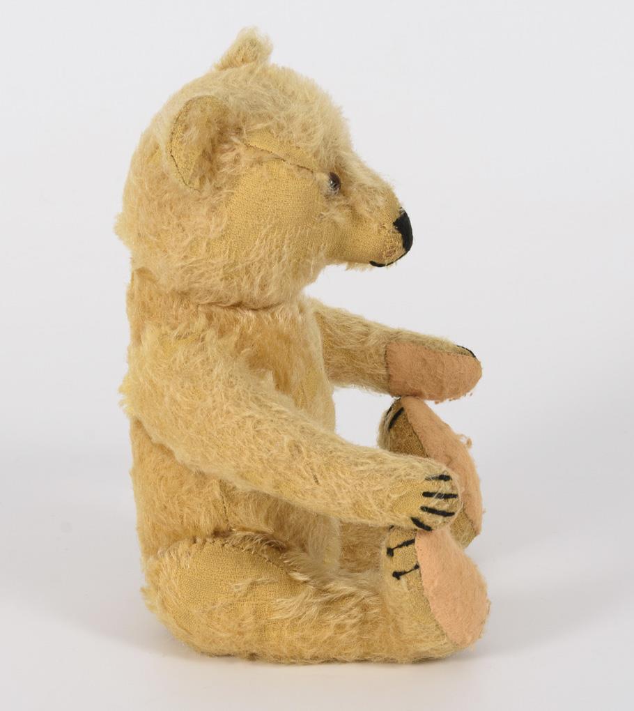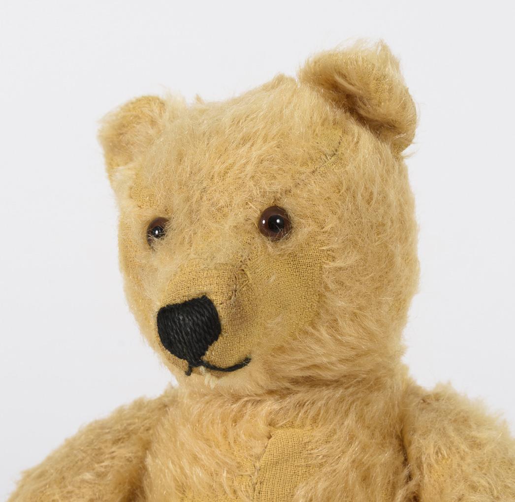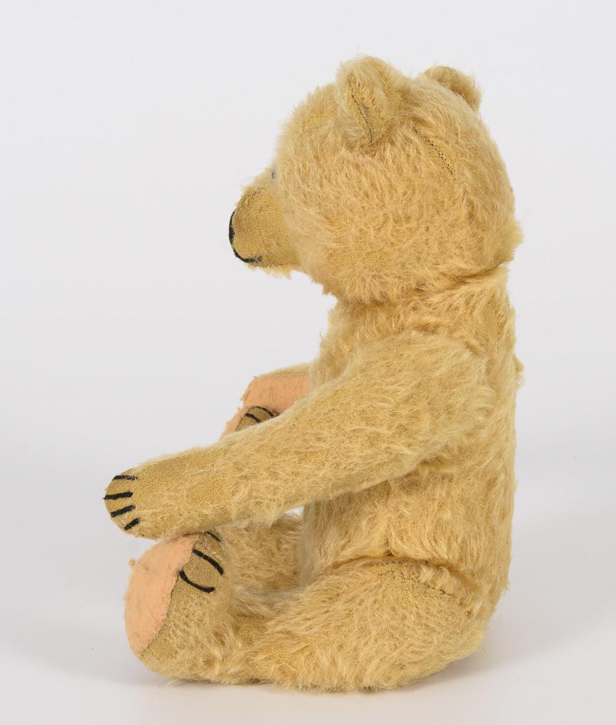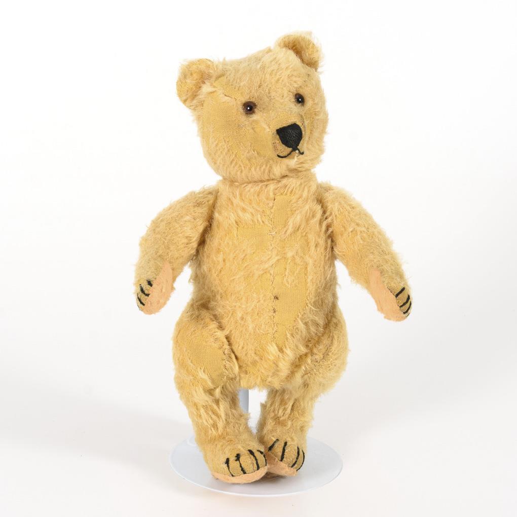 Drehbarer Kopf, Glasaugen, Scheibengelenke, rosa Filzpfoten. Druckstimme verstummt, Fell mit Kahlstellen, Filze ergänzt.
