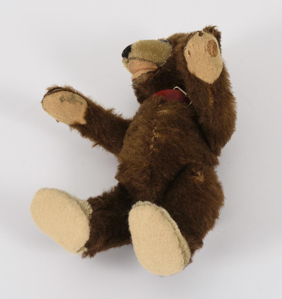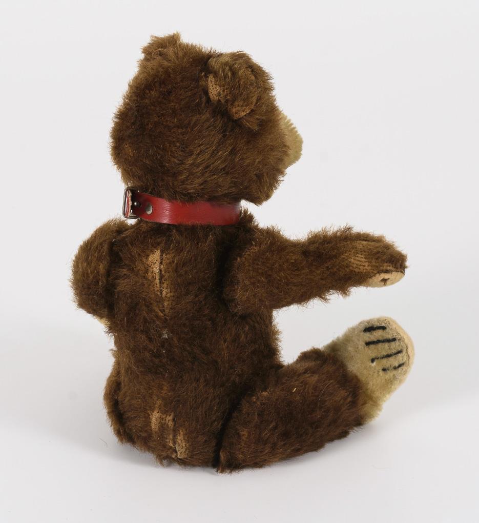 Kleiner Braunbär mit offenem Maul, rotes Halsband mit Glöckchen. Partiell abgeliebt, Mottenfraß an den Pfoten, Fußsohlen fachgerecht ergänzt.