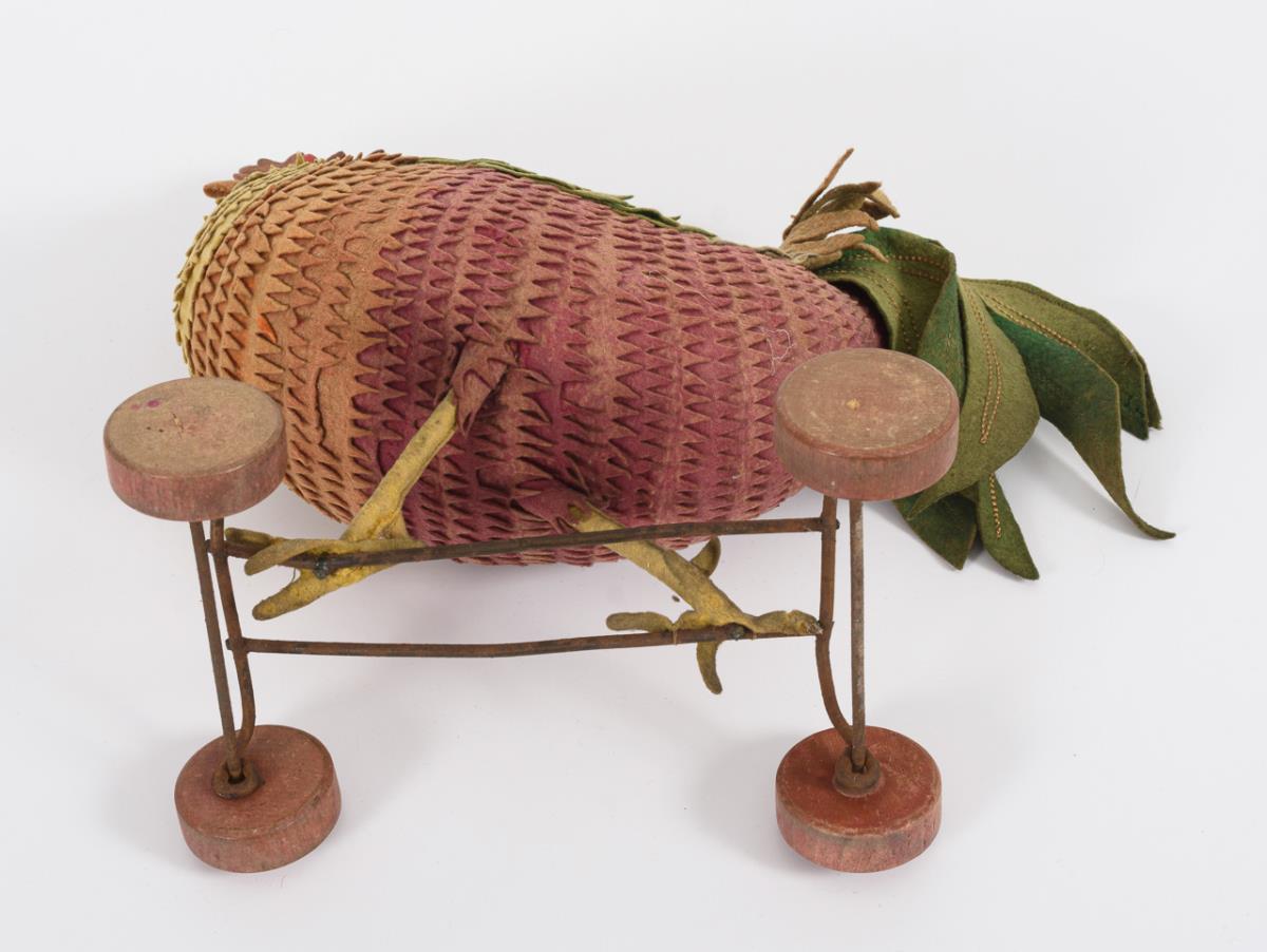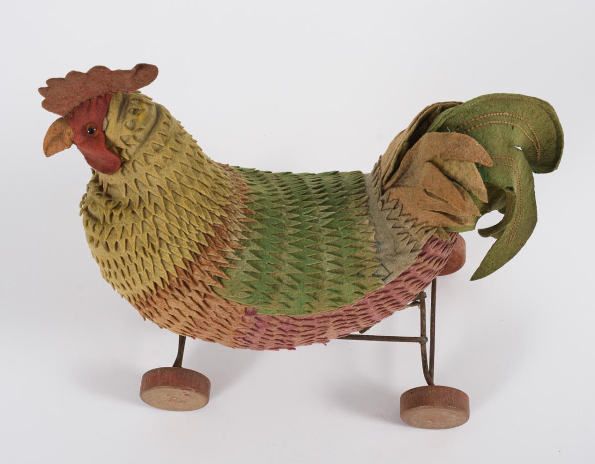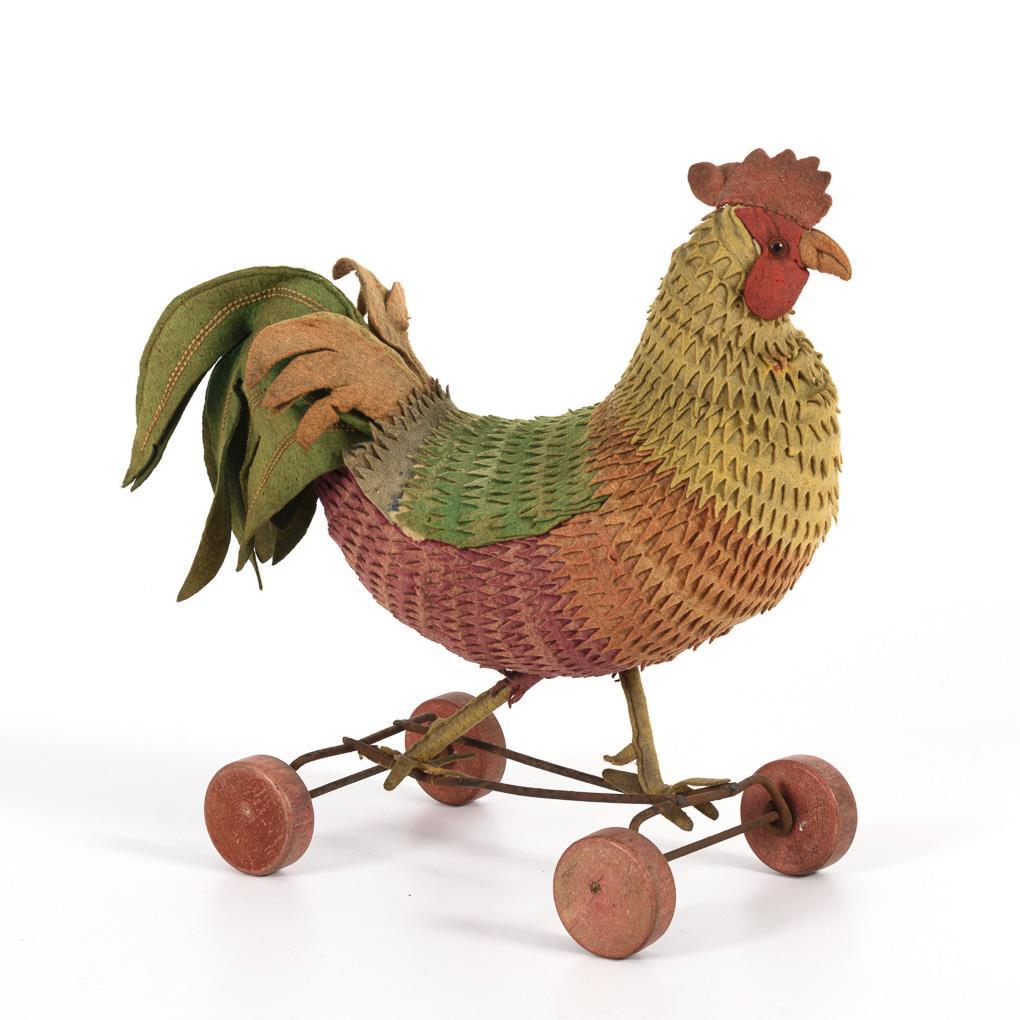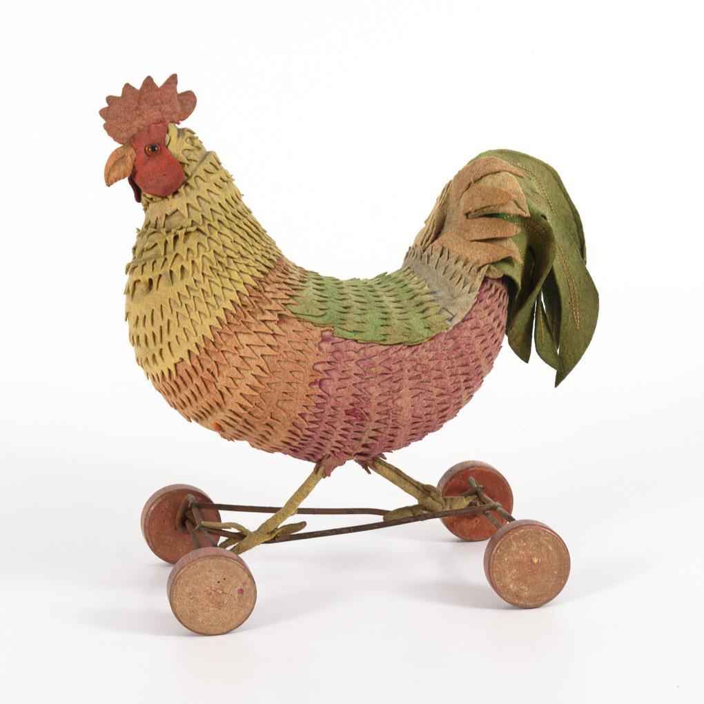Bunter Hahn mit Glasaugen. Auf Metallgestell mit roten Holzrädern. Altersspuren (Farbe verblichen).