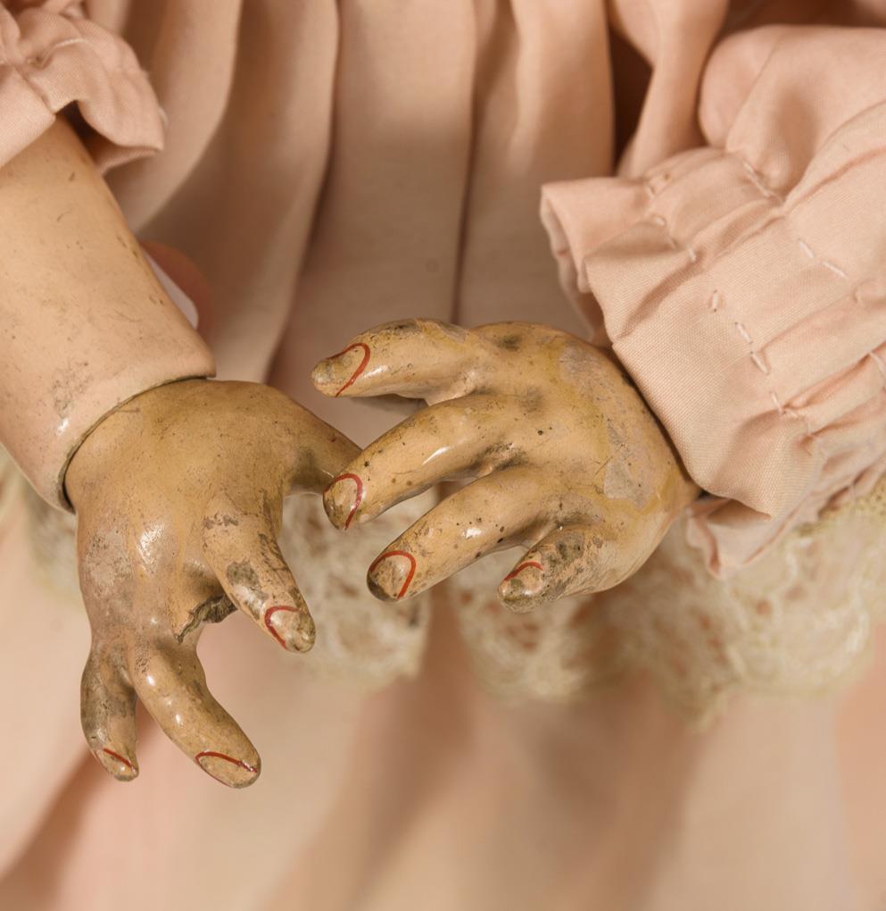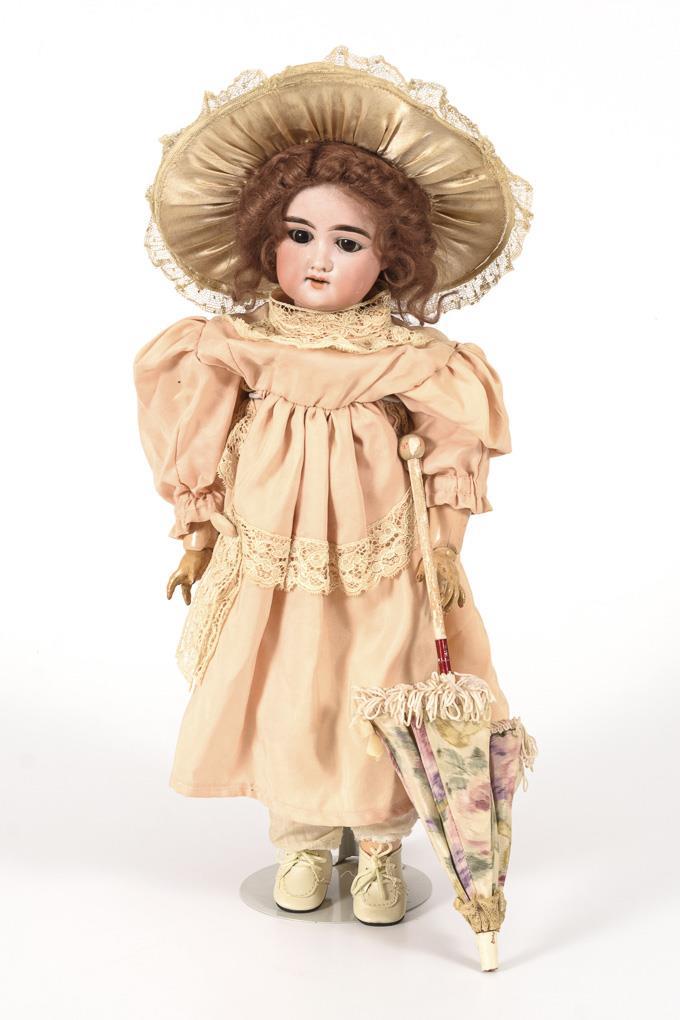 Kurbelkopf, braune Schlafaugen, rötliche Mohairperücke mit Flechtfrisur. 15-teiliger Gliederkörper, rot gestempelt "Germany 1 1/2". Rosa Seidenkleid, passender Hut, defekter Sonnenschirm. Kopf durchleuchtet: ohne Defekte, Lider berieben. 1 Finger fehlt.