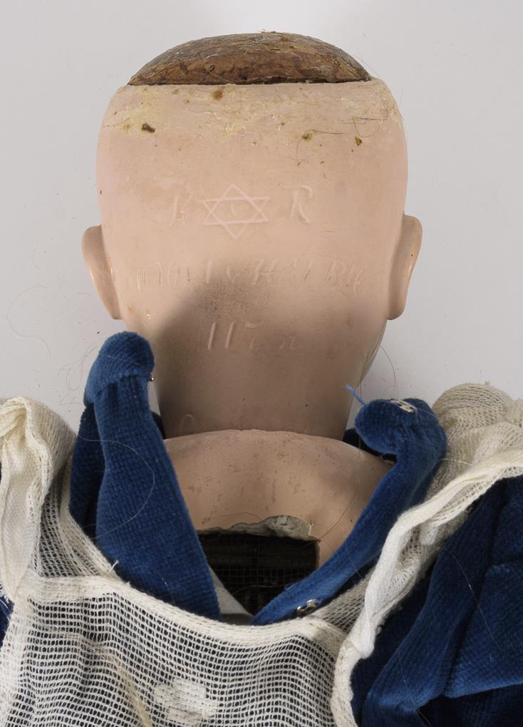 Kurbelkopf, blaue Schlaf-/Schelmenaugen, blondgelockte Mohairperücke. 15-teiliger Gliederkörper mit 2-geteiltem Torso und verstummter Stimme. Blaues Samtkleid, weiße Schürze, Wachstuchschuhe. Kopf restauriert.