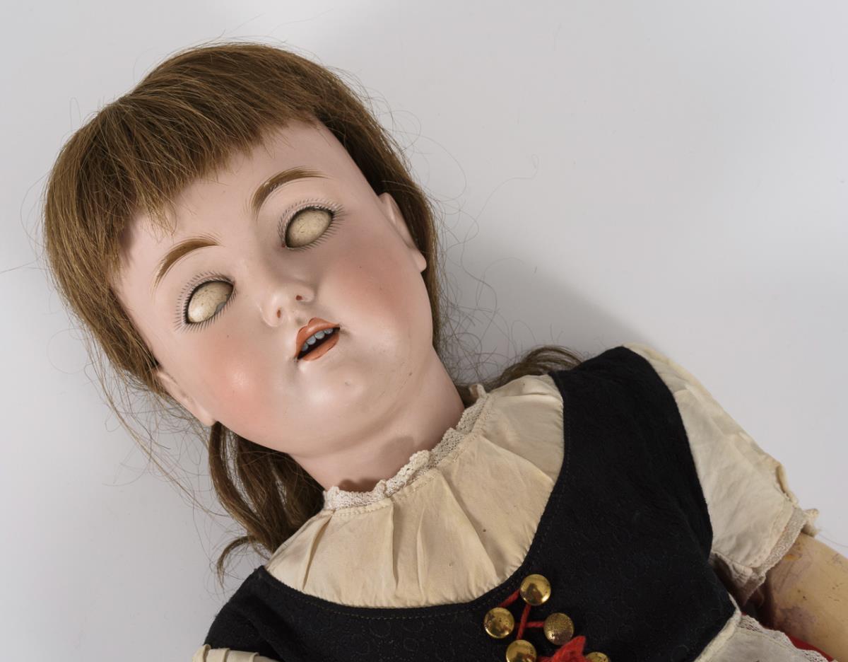 Kurbelkopf, braune Schlafaugen, hellbraune Echthaarperücke. 15-teiliger Gliederkörper mit rotem Stempel "Germany 5". Schwarz-rotes Dirndl, weiße Schürze, braune Wachstuchschuhe, bestickte Trachtenhaube. Fest vergipster Kopfdeckel: Kopf nicht durchleuchtet, ohne sichtbare Defekte. Rechte Ferse minimal bestoßen, 1 Finger geklebt.