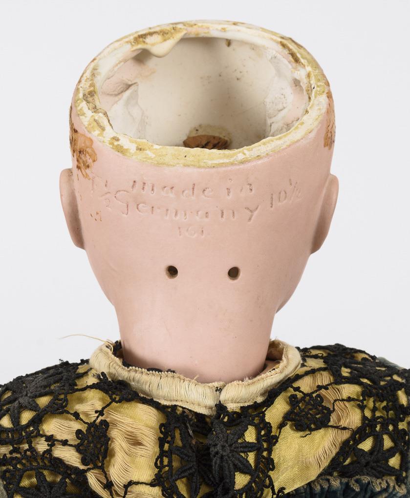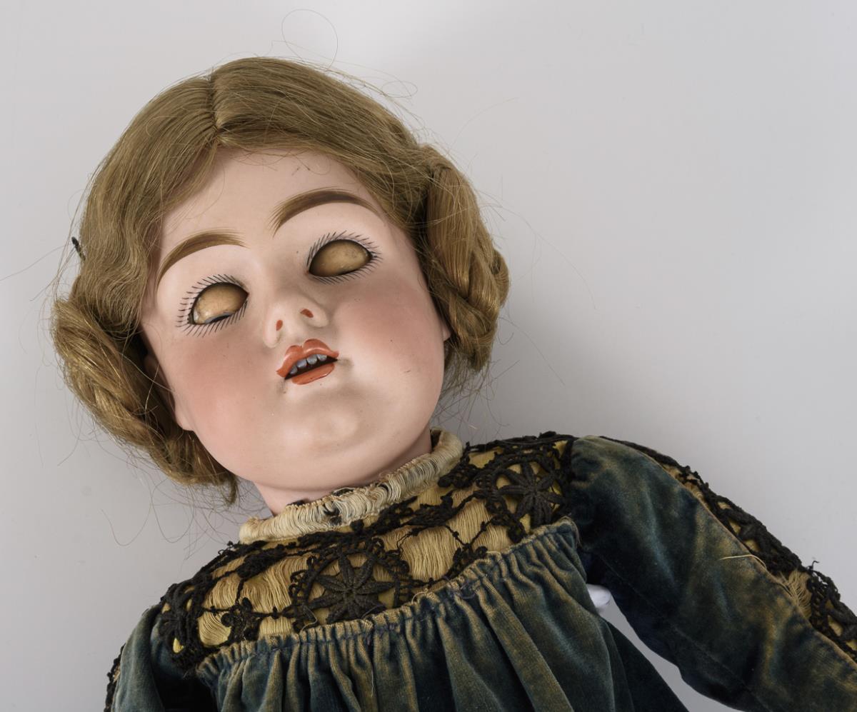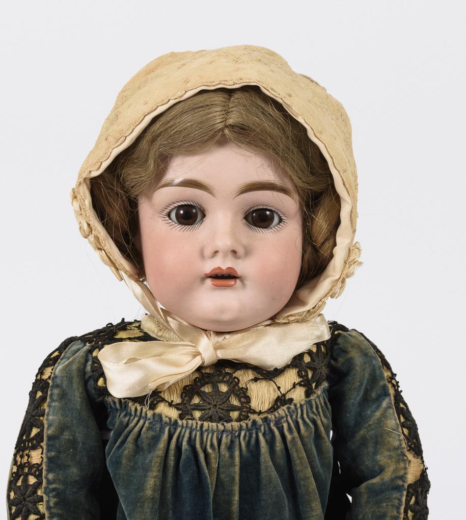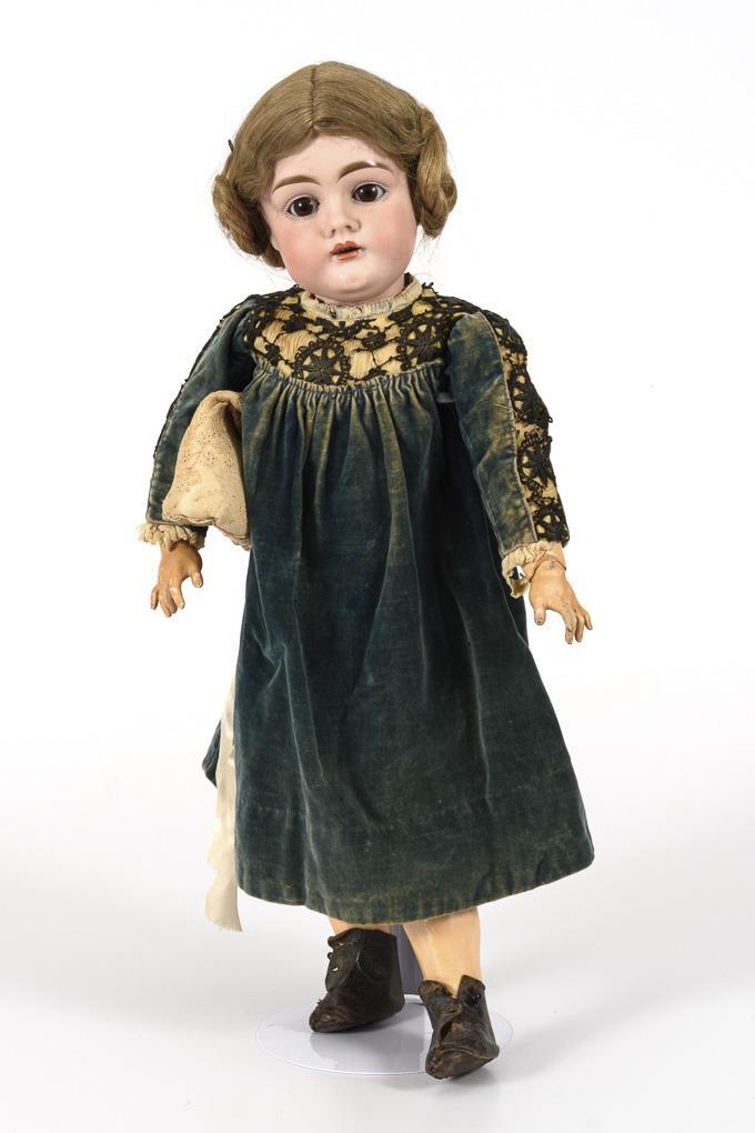 Kurbelkopf, braune Schlafaugen, blonde Echthaarperücke. 15-teiliger Gliederkörper mit rotem Stempel "Germany 3". Altes blaues Samtkleid, weiße Haube, braune Lederschuhe. Kopf durchleuchtet: ohne Defekte. Finger mit Reparaturen.