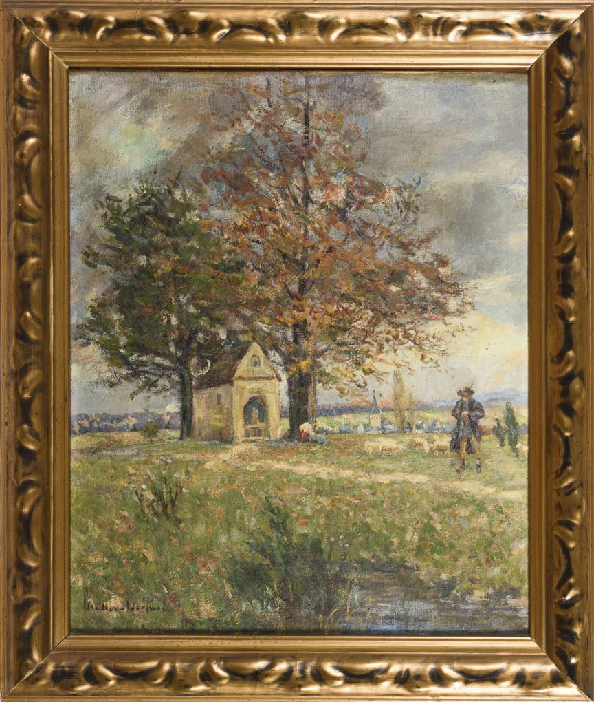 Der Hirte mit den Tieren nahe einer Kapelle auf einem Hügel oberhalb des Dorfes. Leichte Altersspuren.