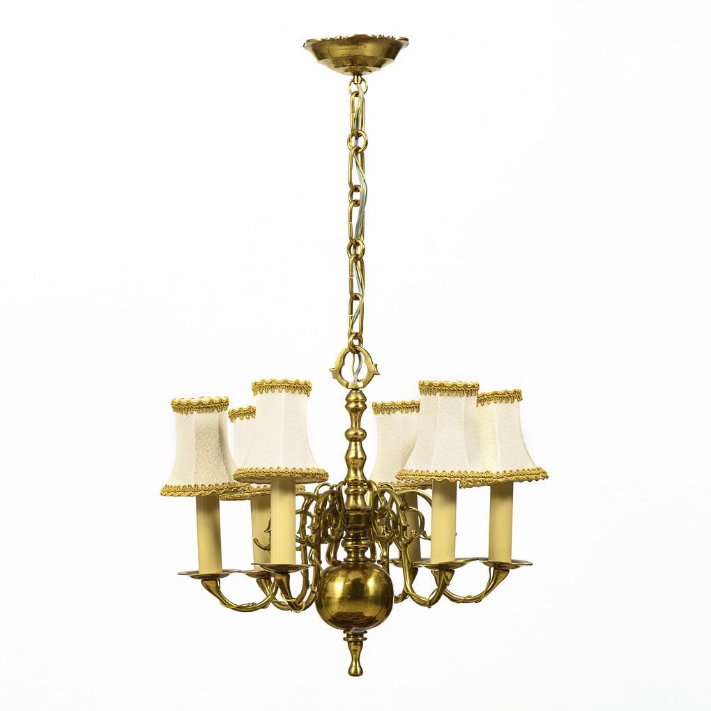 6-flammige Hängelampe mit Messing-Balusterschaft, Kettenaufhängung und Rosettenbaldachin, 6 geschweifte Arme mit stoffbezogenen, champagnerfarbenen Lampenschirmen; dazu 4 Ersatzschirme. Leichte Alters-/Gebrauchsspuren.