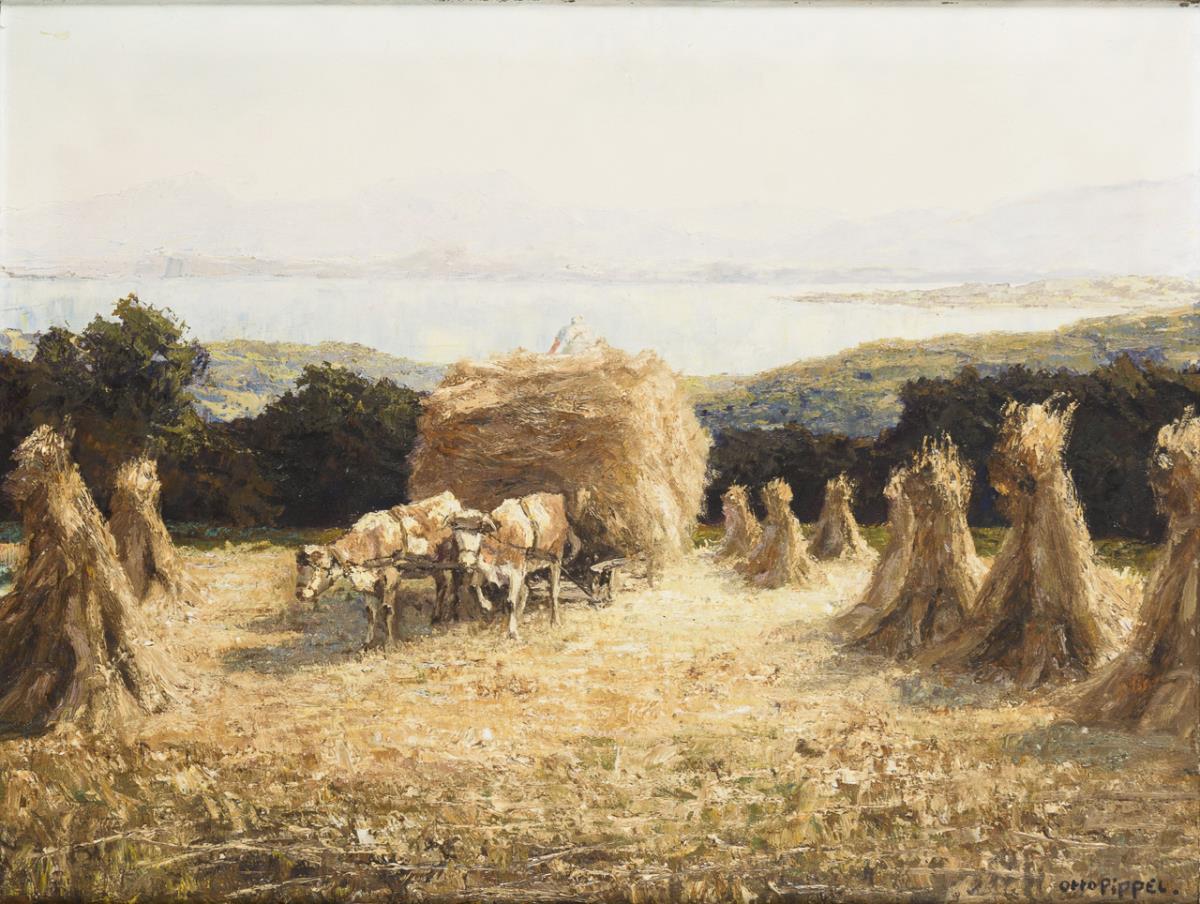 Erntelandschaft mit Rindern am Heuwagen zwischen großen Kornhocken und Blick zum See. Minimale Altersspuren.
