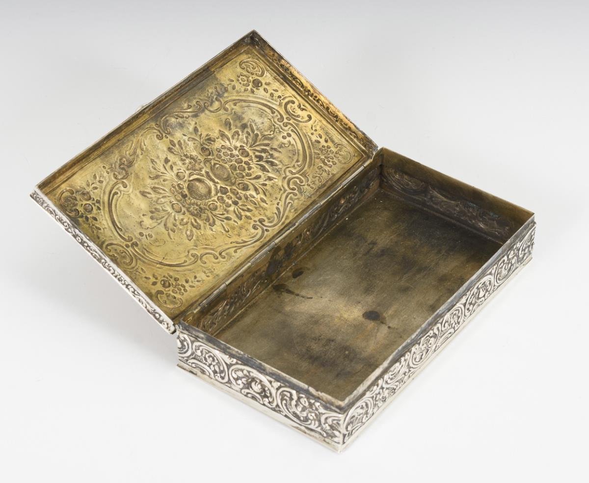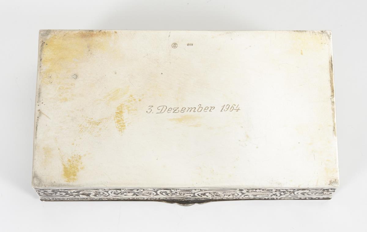 Reliefierte Dose mit Rosen- und Rocaillenzier. Unterseitige Gravur: "3. Dezember 1964". Innenvergoldung berieben.