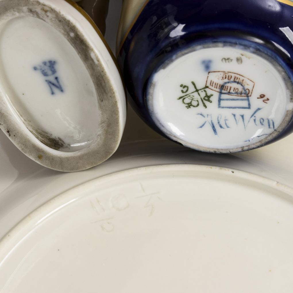1x Nymphenburg: Teller mit der Darstellung einer aus den Wolken schauenden Elfe (Ø 21 cm). / 1x Rosenthal: Zylindervase mit kobaltblauem Teilfond und der schauseitigen Darstellung einer in das Wasser schauenden Elfe (H 11,5 cm). / 1x Neapelmarke: stehender Männerakt (H 11,5 cm). Partiell minimaler Goldabrieb, Vasenrand restauriert.