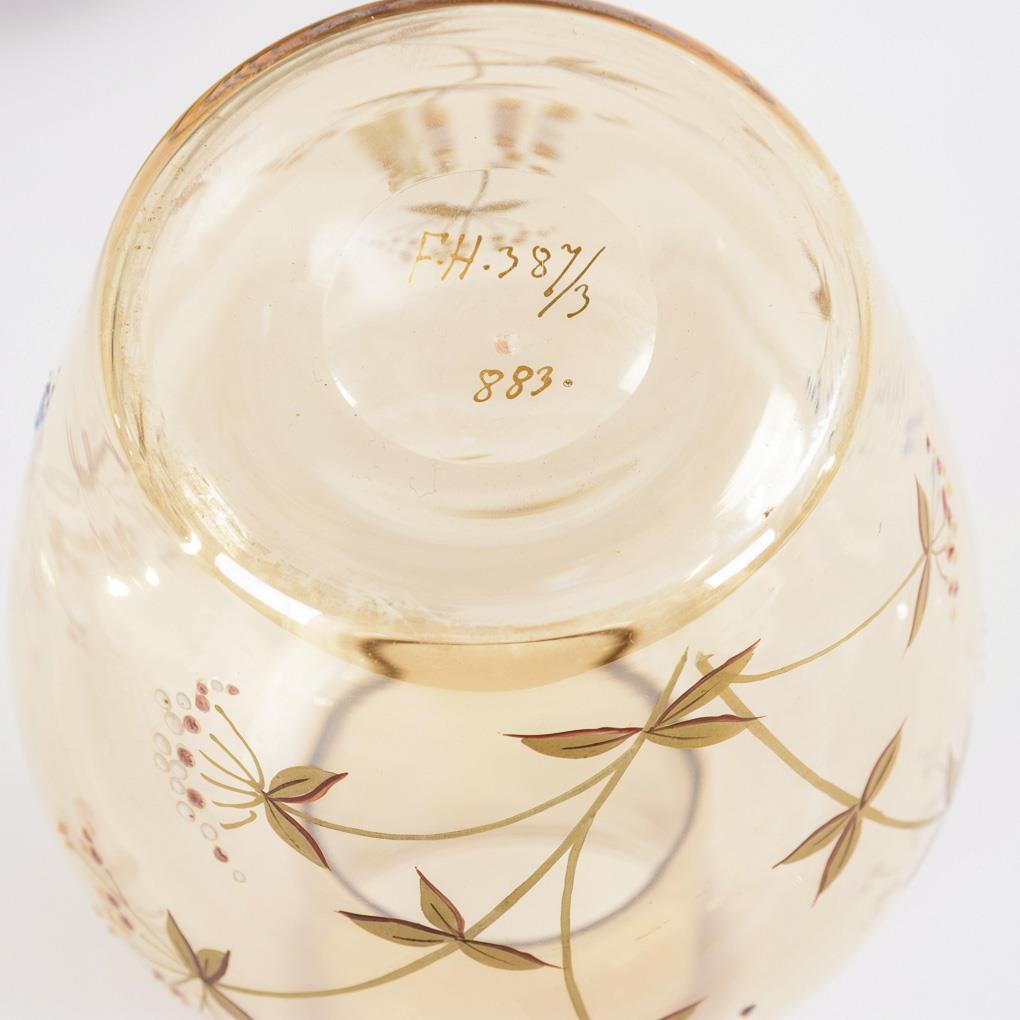 Konkave Dose aus violettem, längsoptisch formgeblasenem Glas, mit violettem Faden netzartig umsponnen; metallmontierter Rand mit Deckel und Bügelhenkel. / Balustervase Fritz Heckert (signiert "FH 387/3 883."): aus farblosem, irisiertem Glas mit polychromer Emailmalerei und Goldstaffage. Fäden der Dose partiell bestoßen.