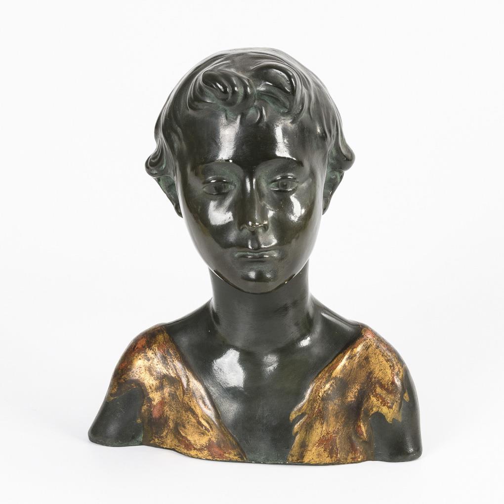 "Durabit" bronzefarben dunkelgrün gefasst, teils vergoldet. Klebezettel auf der Standfläche: Plastik, Anstalt für figürliche Kunst, Würzburg mit Titel und Materialhinweis. H 35 cm.