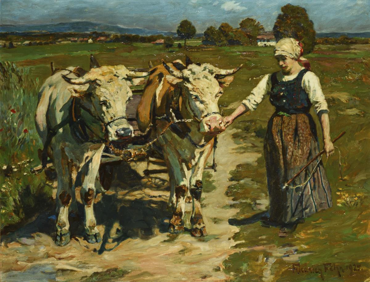Junge Magd mit dem Ochsenkarren im hellen Sonnenschein nahe dem Bauernhaus.