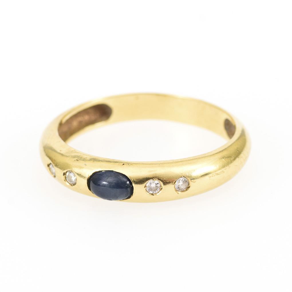 Mittlerer Reif mit Saphircabochon und 4 kleinen, eingelassenen Diamanten.