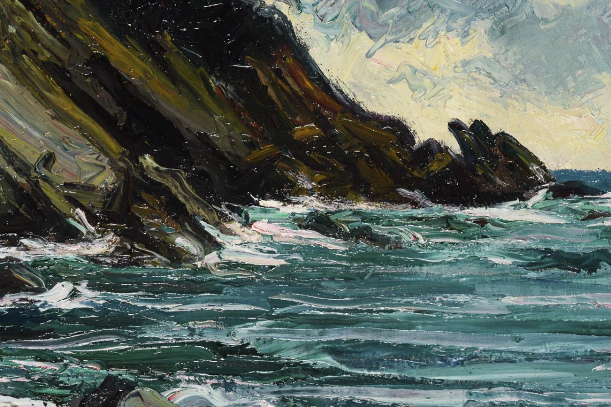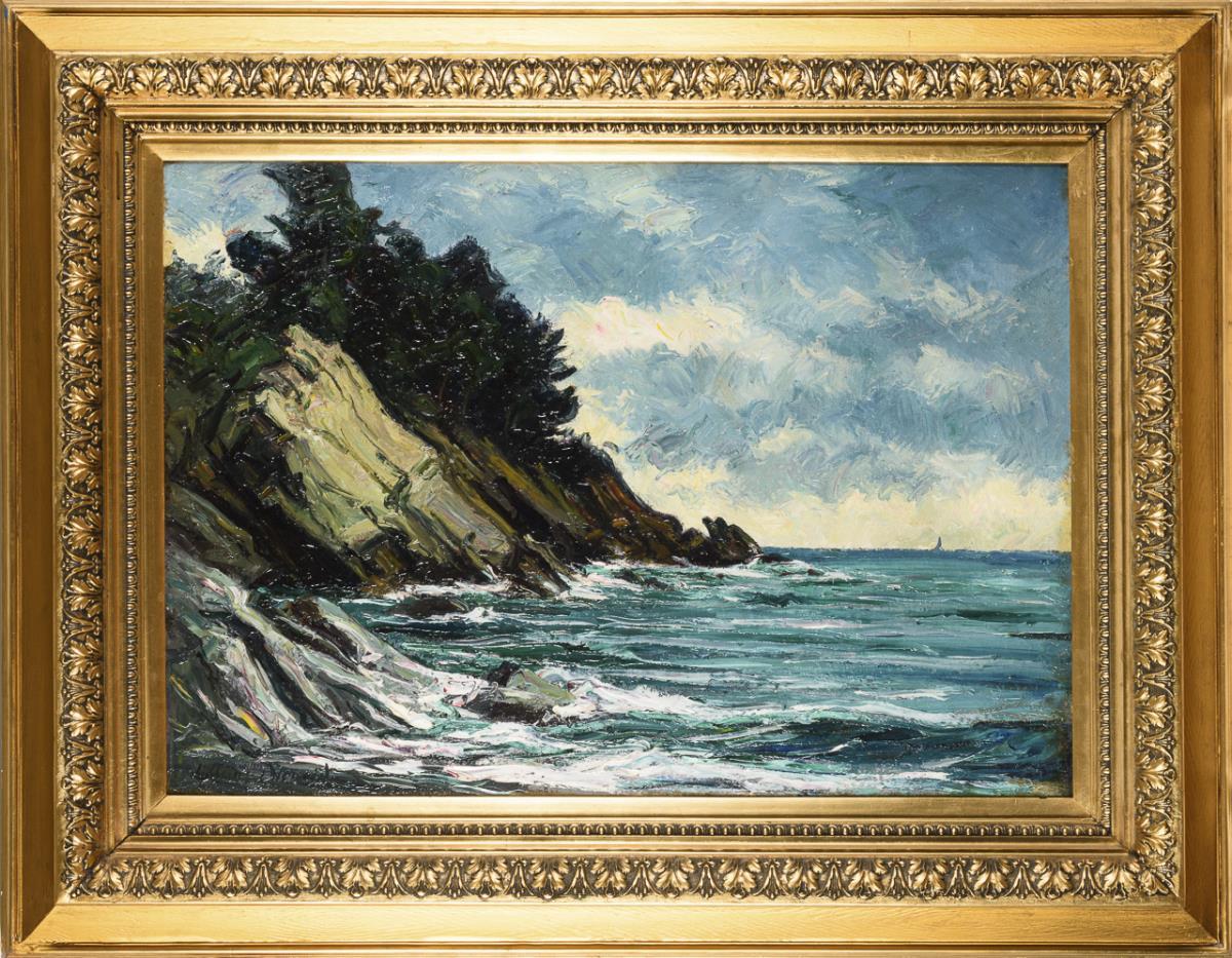 Pastos gemalte felsige Küste mit Waldstück unter wolkigem Himmel. Leichte Altersspuren.