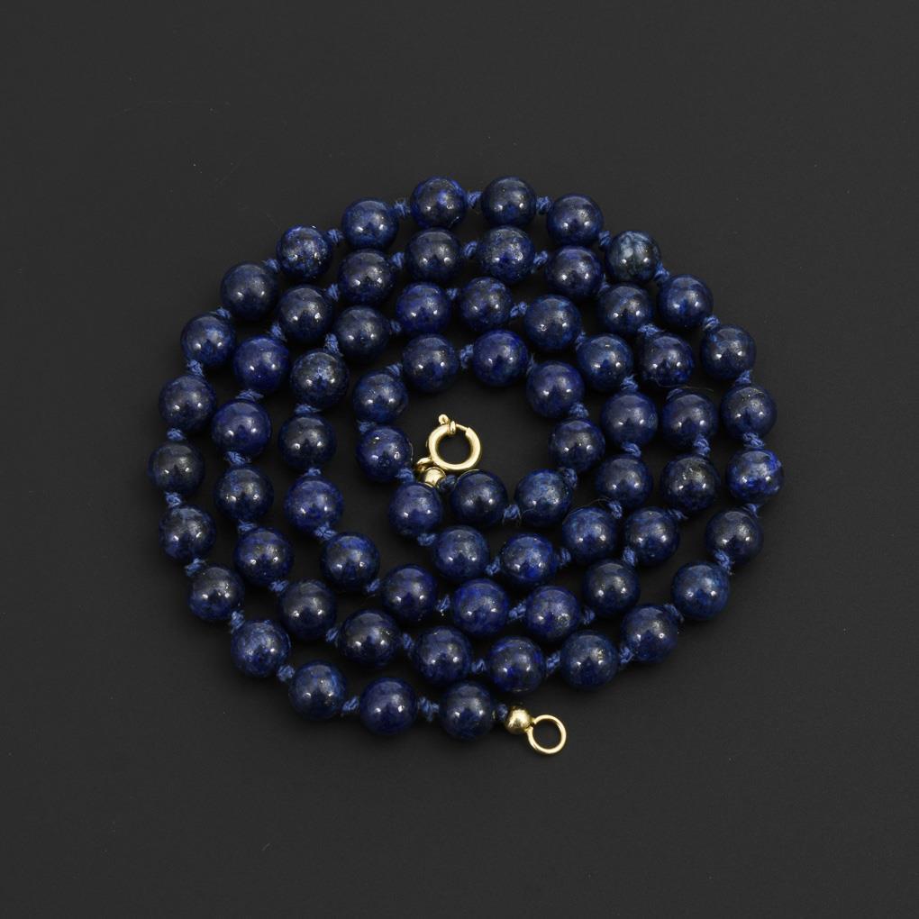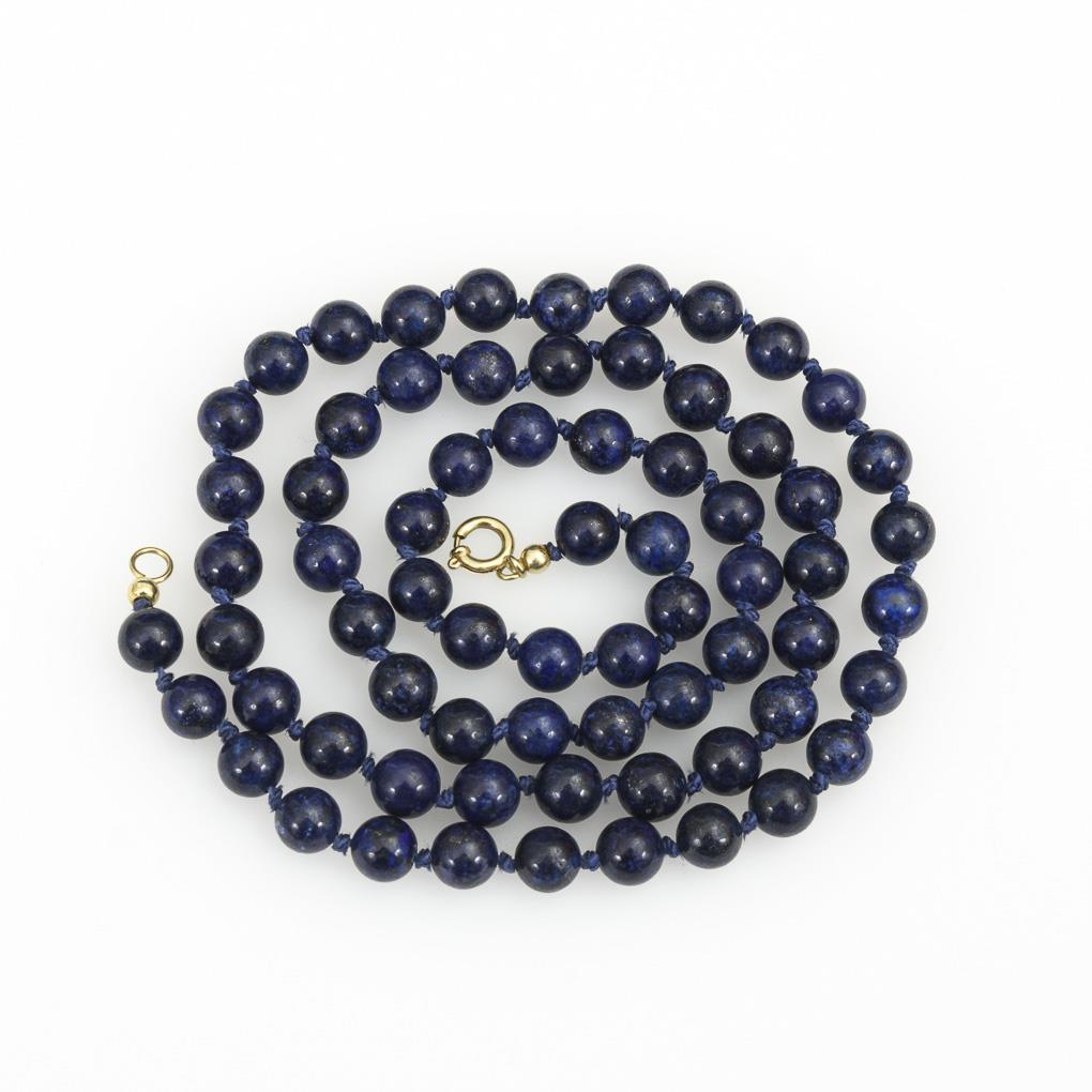 Schnürkette mit Lapiskugeln in Einzelverknotung, an Ringfederschließe.