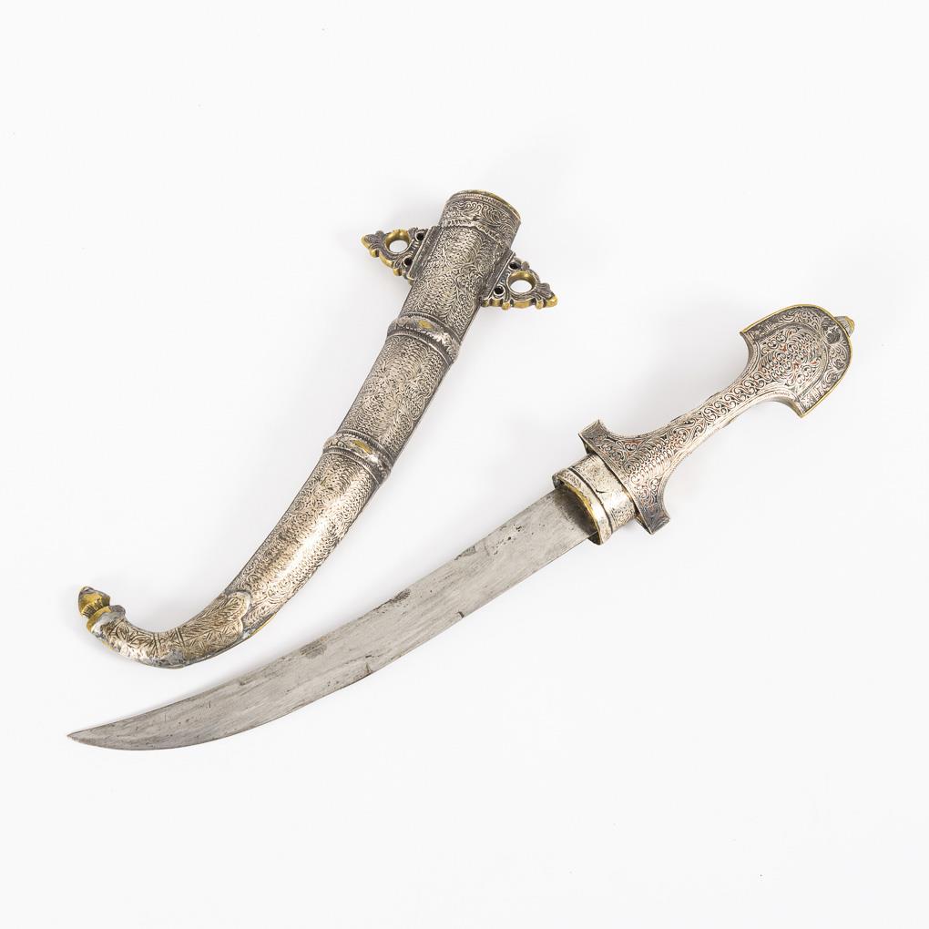 Zweischneidige Klinge mit unterschiedlich langen Schneiden. Griff und Scheide aus Messing und silberfarbenem Metall. Oberfläche schön ziseliert, Griff mit roten und schwarzen Tauschierungen. Alters- und Gebrauchsspuren.