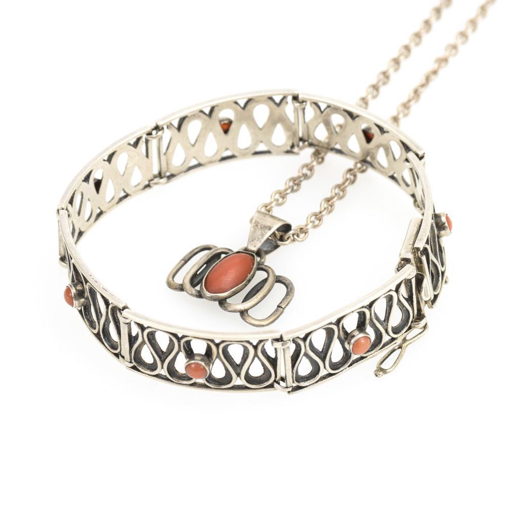 Durchbrochenes Gliederband und Anhänger mit Korallencabochons. Lange Ankerkette. Kastenschlösser mit Achtersicherungen.