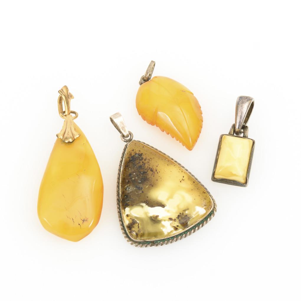 2 zargengefasste und 2 ungerahmte Bernsteine an montierten Ösen.