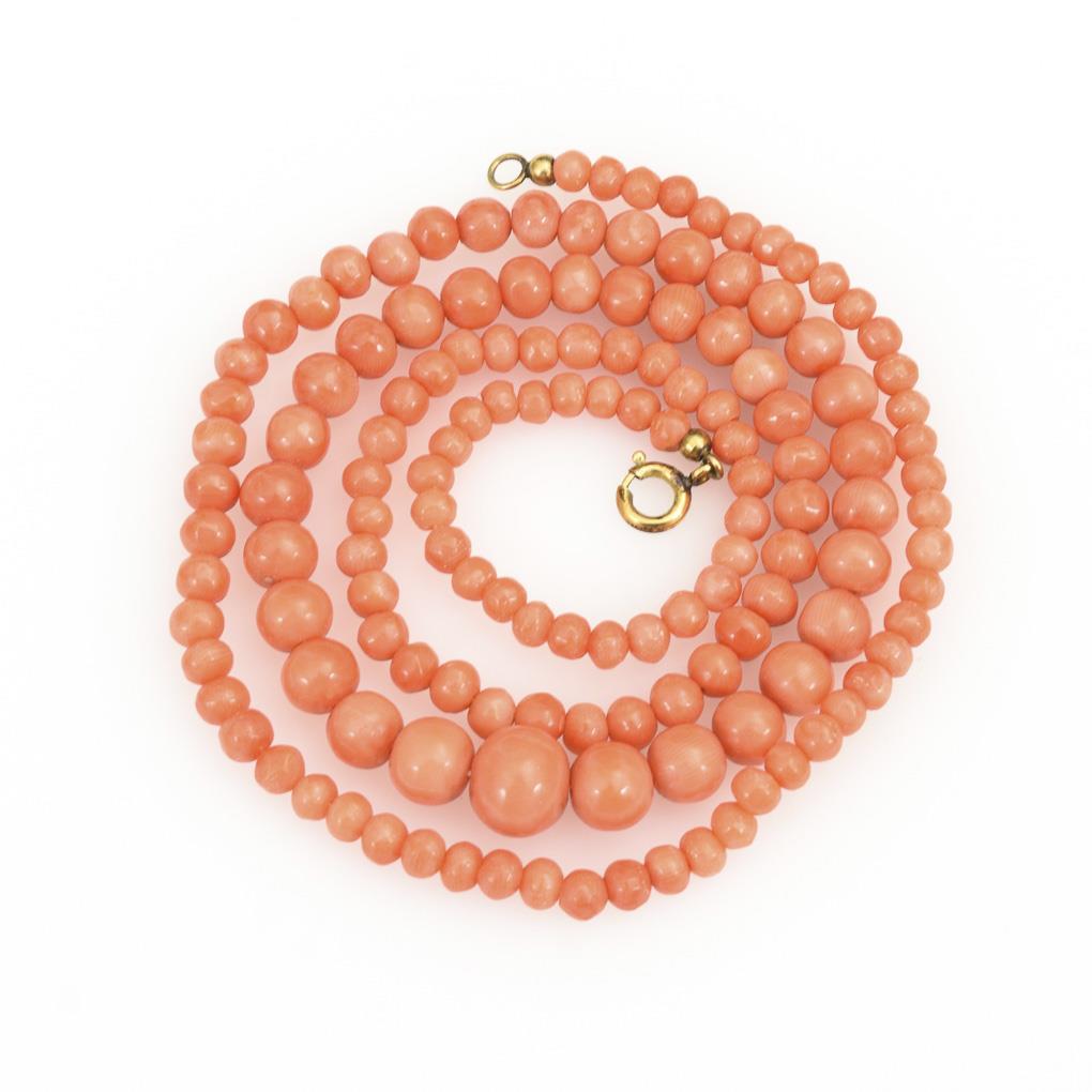 Schnürkette mit Korallenkugeln im Verlauf, an Ringfederschließe.