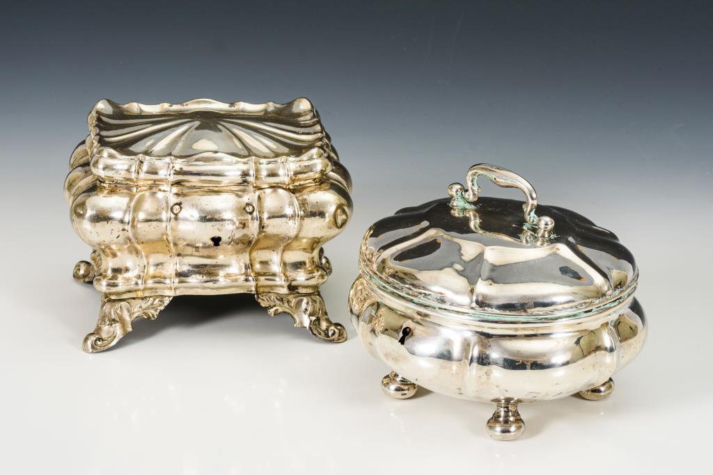 Ovale Silberdose verschlossen, beide ohne Schlüssel. Alters- und Gebrauchsspuren.