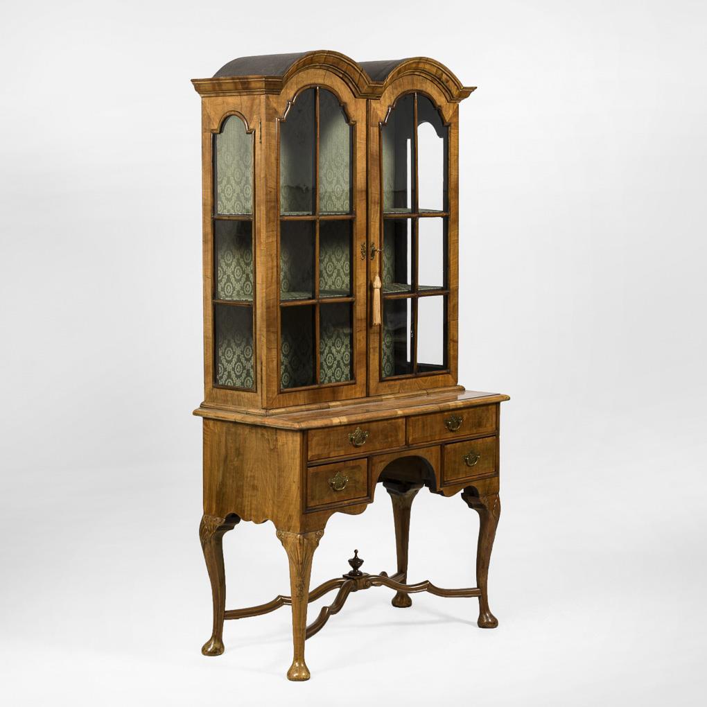 Zierlicher Vitrinenschrank mit 2-türigem, 3-seitig verglast-versprosstem Aufsatz und doppelt geschwungenem Giebel, vorgestelltes Unterteil mit 4 kleinen Schüben auf 4 geschwungenen Beinen mit Tatzenfüßen und Palmettenzier, Fußbereich mit geschweifter Kreuzverstrebung und Urnenbekrönung. Innen mit grünem, floral gemustertem Stoff ausgekleidet, 2 Einlegeböden. Alters-/Gebrauchsspuren, Trockenrisse.