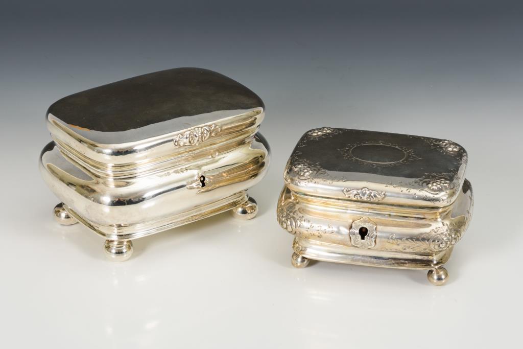 1x Silber, 1x versilbert.8,5 x 13,5 x 10 cm / 10,5 x 17 x 12,5 cm.304 g.