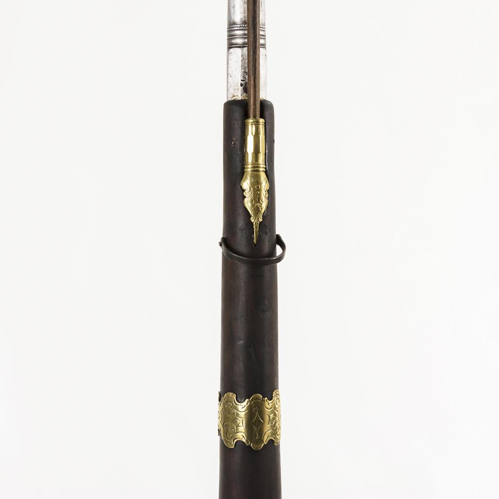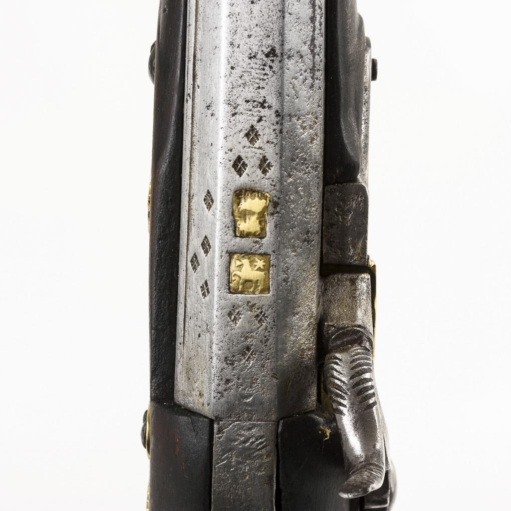 Aptierte Waffe. Lauf in der hinteren Hälfte achteckig, gestempelt mit sieben unterschiedlich verteilten Rauten und zwei eingelegte Marken, davon eine unkenntlich. Ladestock vorhanden. Waffe professionell restauriert, Mechanik nicht überprüft.