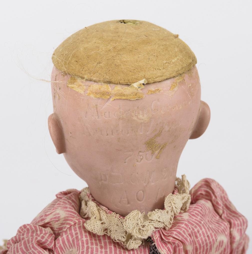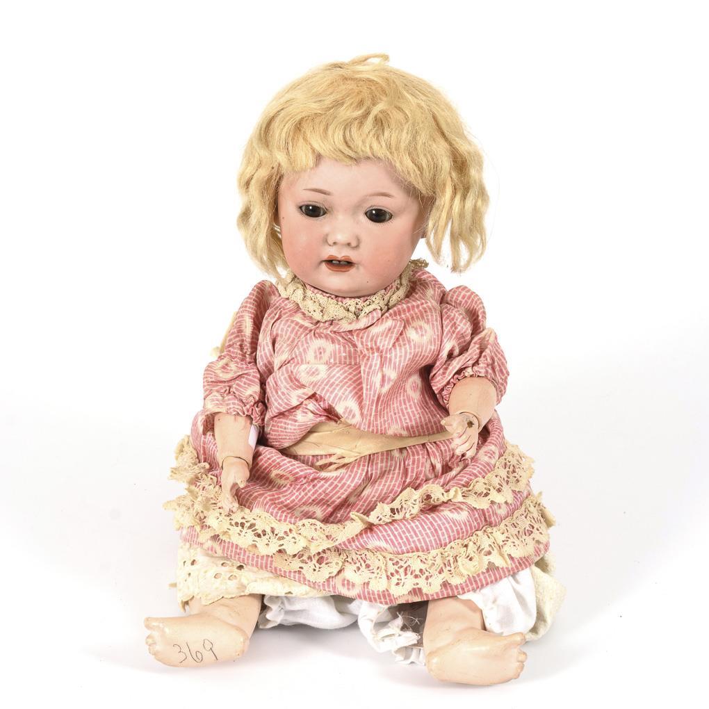 Kurbelkopf, braune Schlafaugen, blonde Mohairperücke. Sitzbabykörper mit Gliederarmen. Rosa-weißes Kleidchen. Kopf durchleuchtet: ohne Defekte. Arme eventuell ergänzt, kleiner Farbdefekt an der linken Hand.