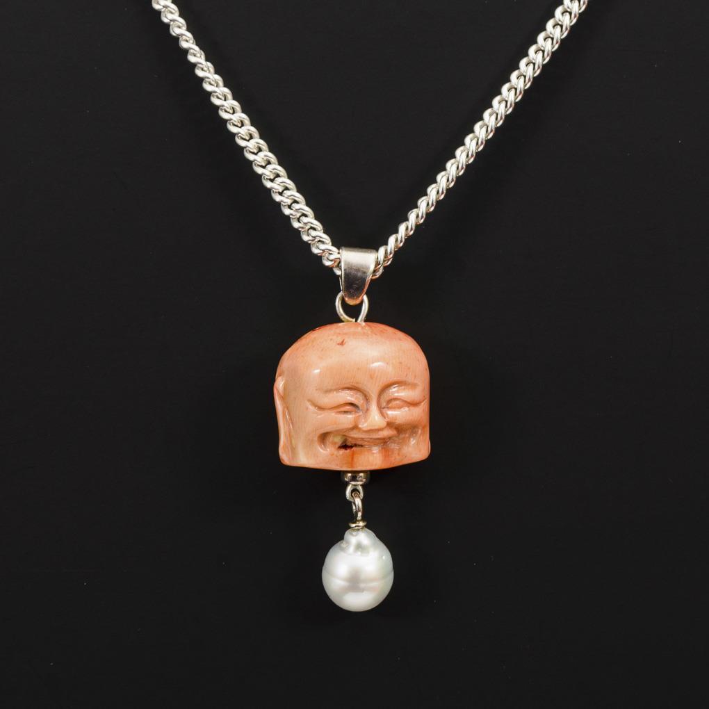 Buddha-Kopf-Anhänger Wurzelkoralle und Zuchtperle an Kette.