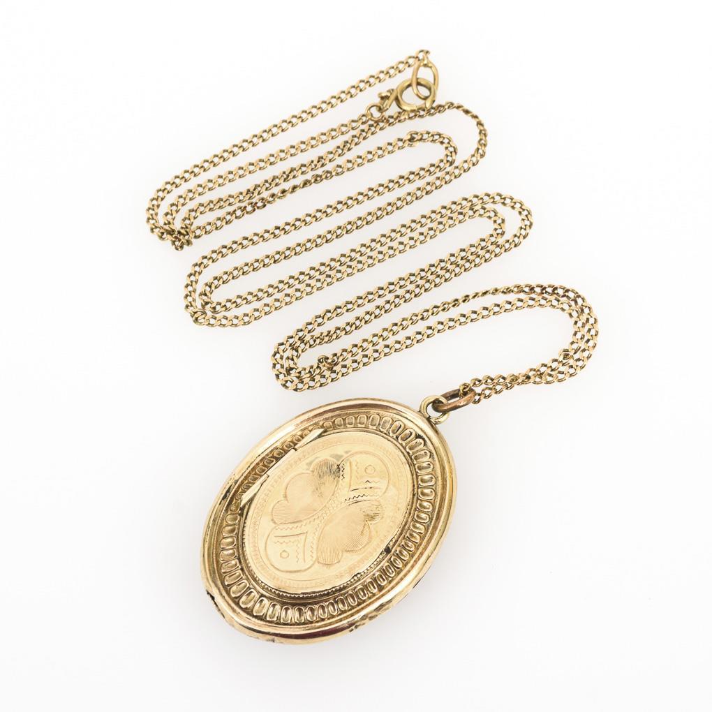 Schaumgold (Goldblech aus niedriger Legierung, dünn gewalzt). Kette Gelbgold 333 gestempelt. Medaillon 4 x 2,8 cm. Kette L 63 cm. Kette 3,9 g. Anhänger 7,7 g.