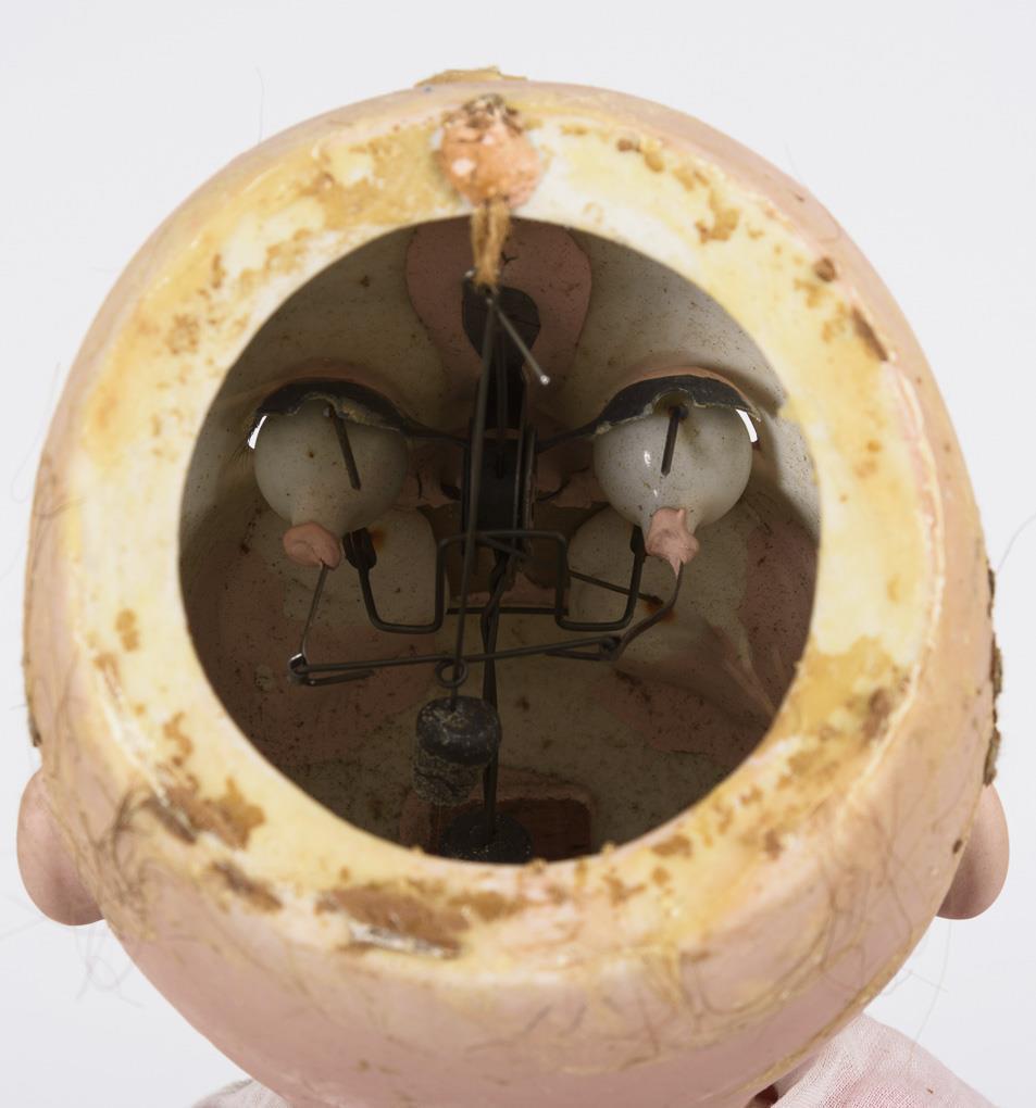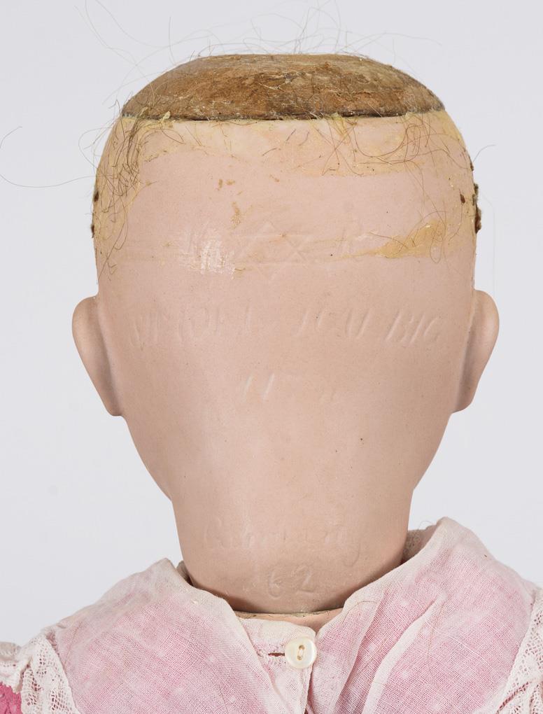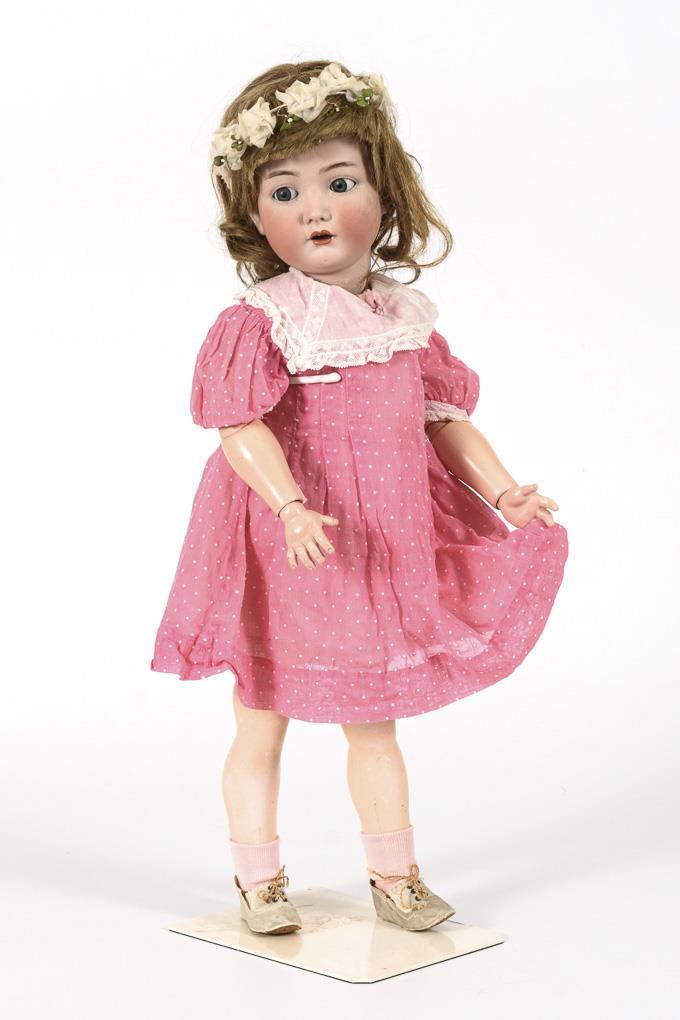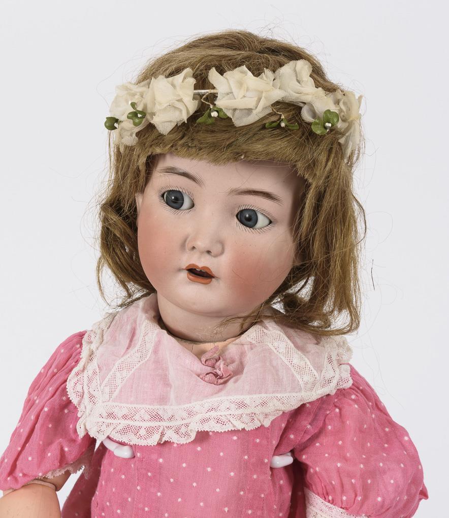 Kurbelkopf, blaue Schlaf-/Schelmenaugen, dunkelblonde Echthaarperücke. 17-teiliger Gliederkörper mit 2-geteiltem Torso und verstummter Stimme. Rosa Kleid mit weißen Pünktchen, Blumenkranz im Haar. Kopf durchleuchtet: ohne Defekte. Augen minimal verklemmt. 1 Finger rechts minimal bestoßen.