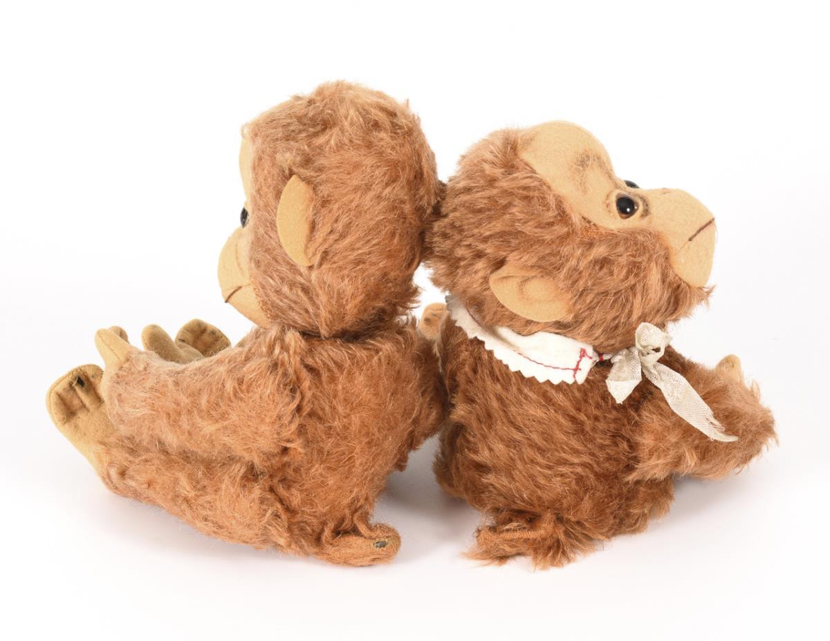 Sitzendes, rotbraunes "Yes-No"-Affenpaar mit beweglichem Kopf und Schwanz. 1x mit weißem Lätzchen. 1x mit kleinen Defekten an den Pfoten, Druckstimmen verstummt.