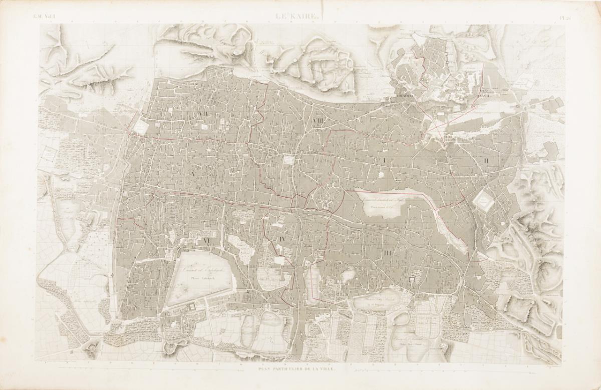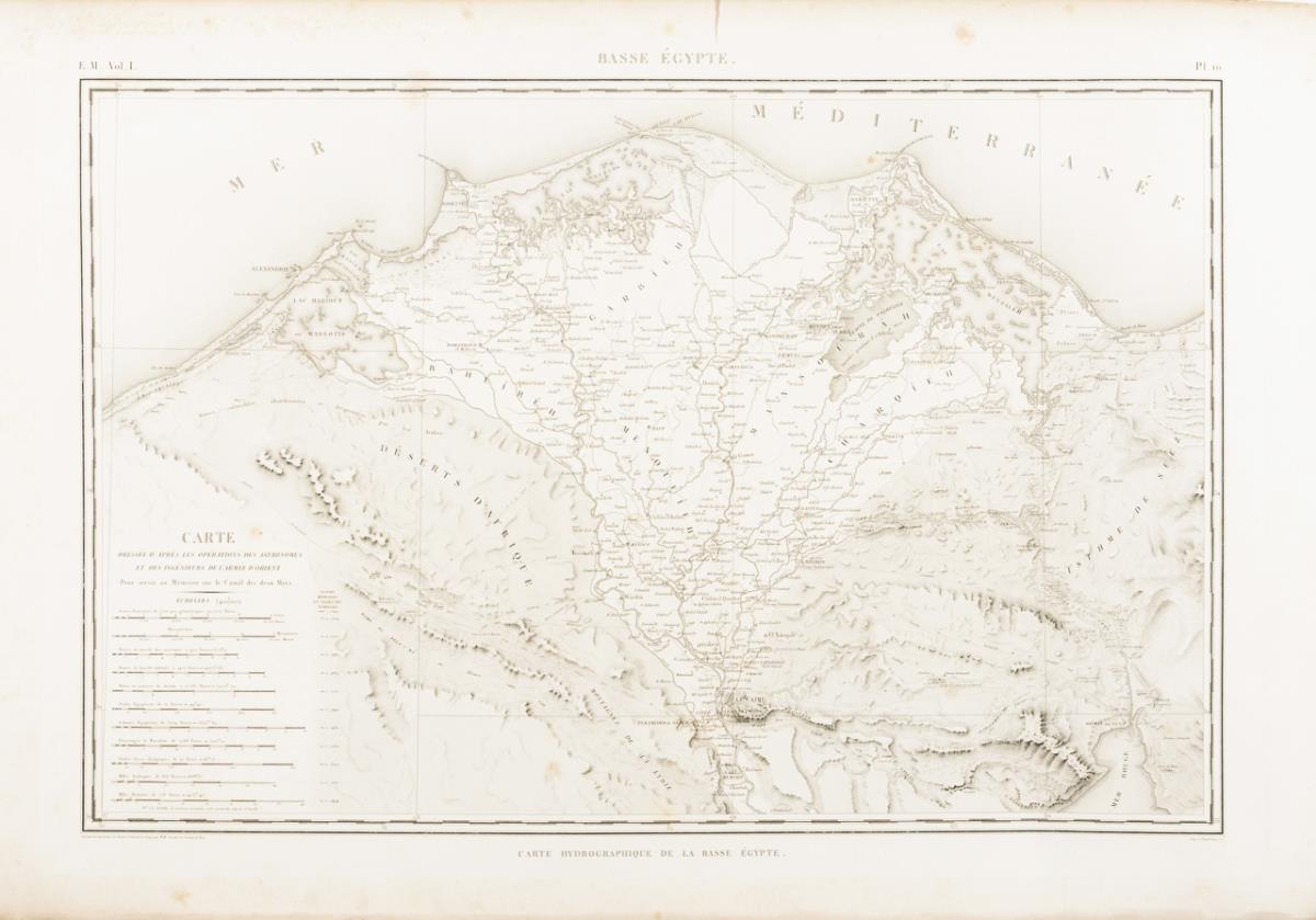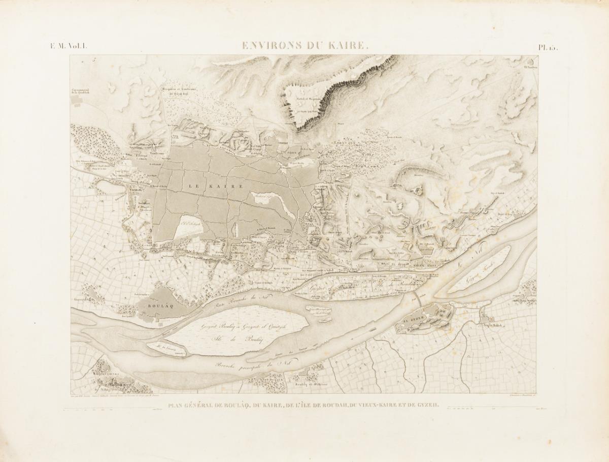 2 Stadtpläne der Stadt Kairo und 1 Landkarte von Ägypten: "Environs de Karie" | "Le Kaire" und "Basse Égypte" aus: "Description de l'Egypte, ou recueil des observations et des recherches qui ont été faites en Egypte pendant l'expédition de l'armée française, publié par les ordres de sa majesté l'empereur Napoléon le Grand, Paris, 1809 - 1822, E.M. Vol. I., Pl. 10, 15 und 26.", hrsg. von Edme Francois Jomard. Das Werk mit mehr als 3000 Abbildungen entstand als Ergebnis der ägyptischen Expedition Napoléon Bonapartes (1798 - 1801), die einen wesentlichen Anstoß zur Entwicklung der Ägyptologie als Wissenschaft gab. Je etwas stockfleckig und griffspurig, Ecken und Ränder mit kleinen Knicken und Rissen.