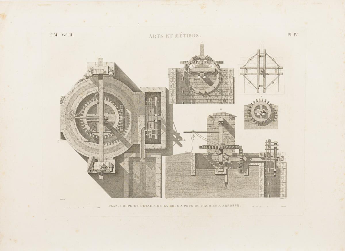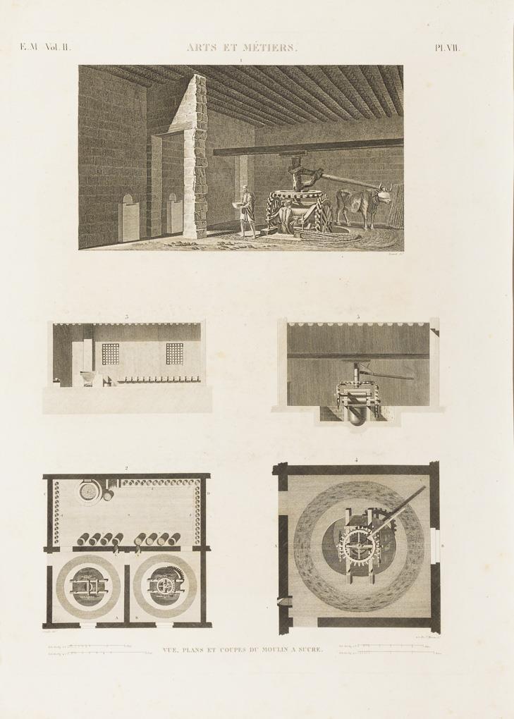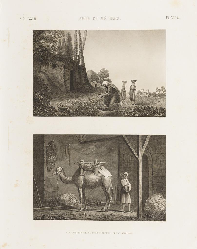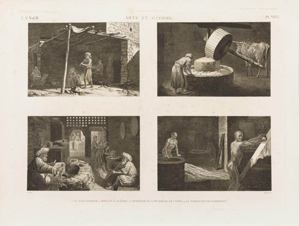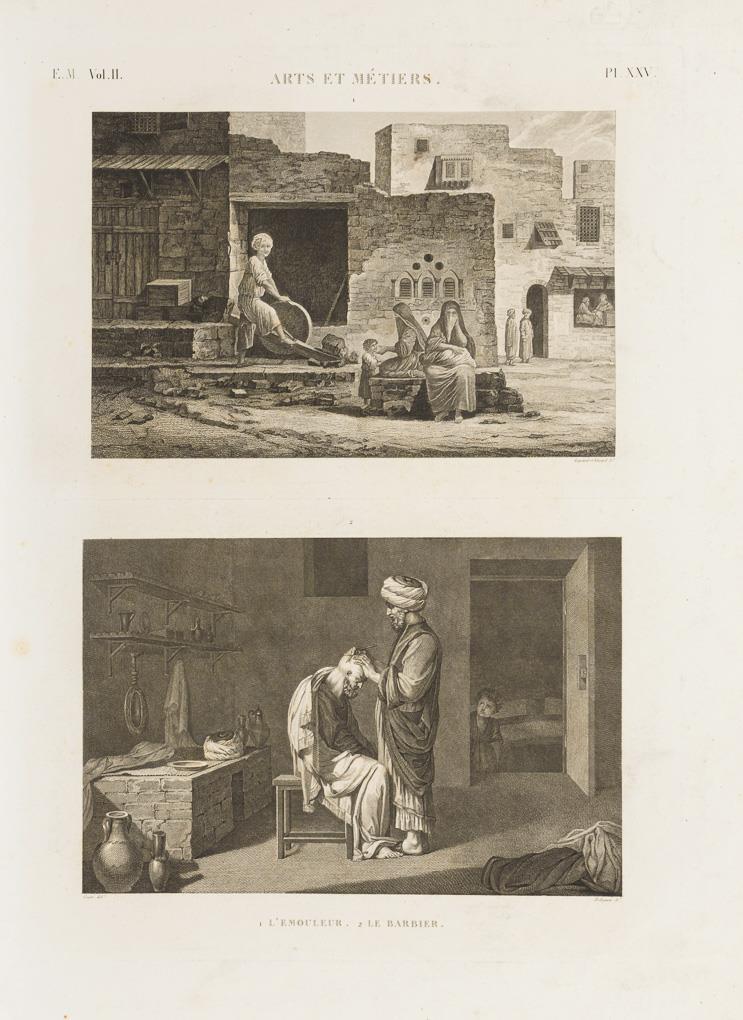 Verschiedene handwerkliche Darstellungen von Handwerkern, Handwerksgerät und Räumlichkeiten nach Zeichnungen von Conté, aus: "Description de l'Egypte, ou recueil des observations et des recherches qui ont été faites en Egypte pendant l'expédition de l'armée française, publié par les ordres de sa majesté l'empereur Napoléon le Grand, Paris, 1809 - 1822, E.M. Vol. II.", hrsg. von Edme Francois Jomard. Das Werk mit mehr als 3000 Abbildungen entstand als Ergebnis der ägyptischen Expedition Napoléon Bonapartes (1798 - 1801), die einen wesentlichen Anstoß zur Entwicklung der Ägyptologie als Wissenschaft gab. Je etwas stockfleckig und mit kleinen Knicken an den Ecken und Rändern.