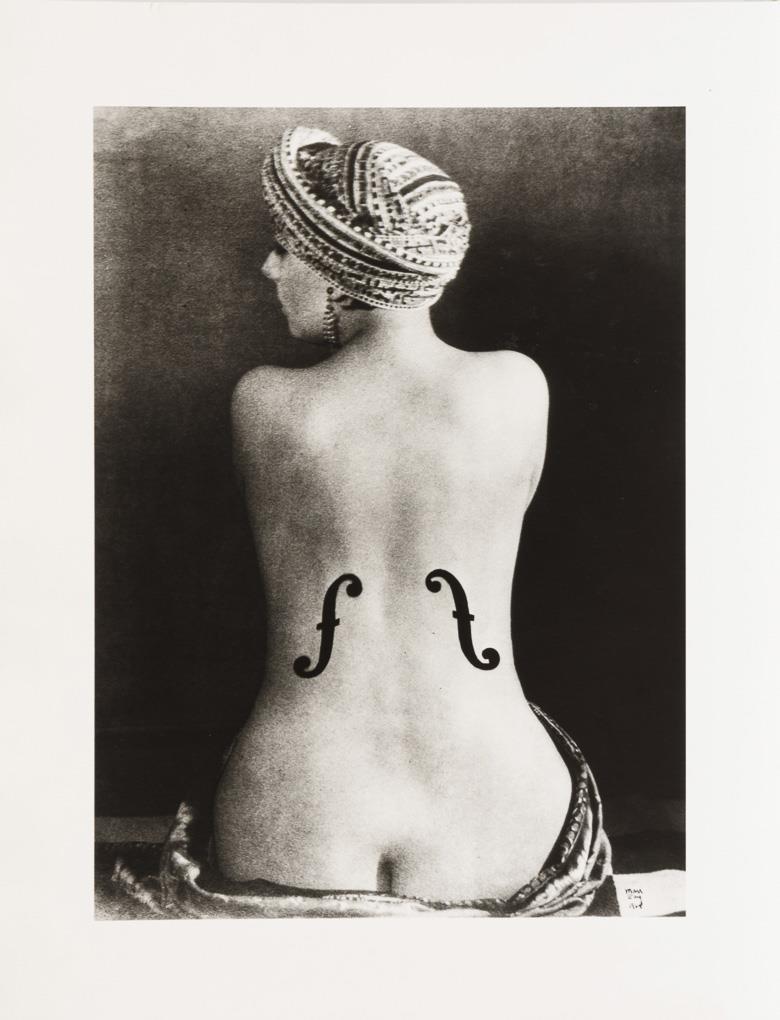 Der surrealistische Rückenakt der Kiki de Montparnasse, Muse und Geliebte des Künstlers, zählt zu einer der berühmtesten, meist publizierten und reproduzierten Fotografien Man Rays. Oberer Rand mit minimaler Bestoßung.