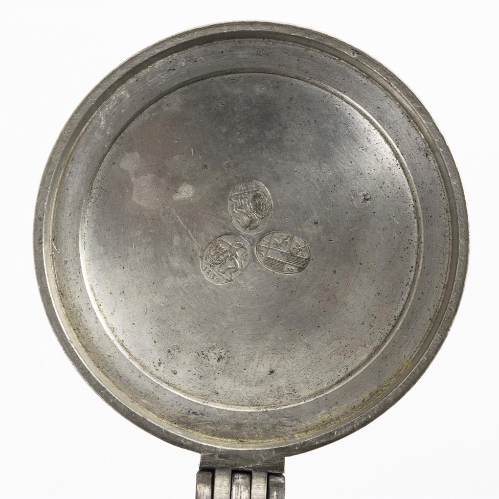 3 Kannen, davon 2 mit Monogramm-Gravuren und Datum "1839". Kleine Kölner Kanne mit Eicheldrücker. 2 Maße ("Quartern" bzw. "1/2 Gilt"). Teils Lötreparaturen, Alters-/Gebrauchsspuren.