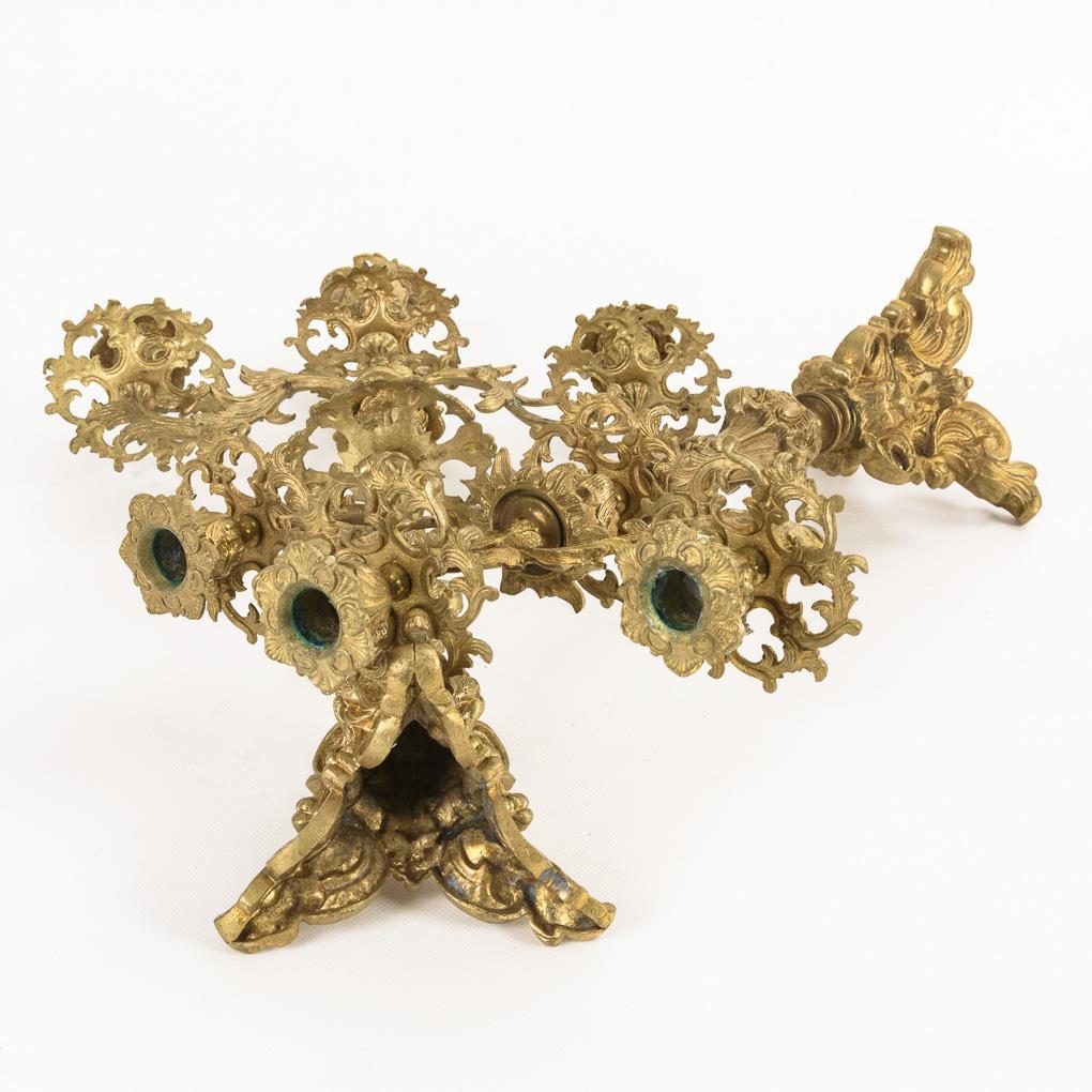 Reich im Barock-Stil mit Löwenmaskaronen und Blattwerk verzierte Leuchter. Durch abnehmbaren Armaufsatz auch 1-flammig verwendbar. 1 Arm angebrochen, sonst kaum Alters-/Gebrauchsspuren.