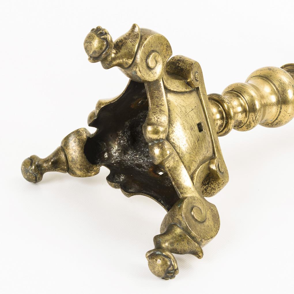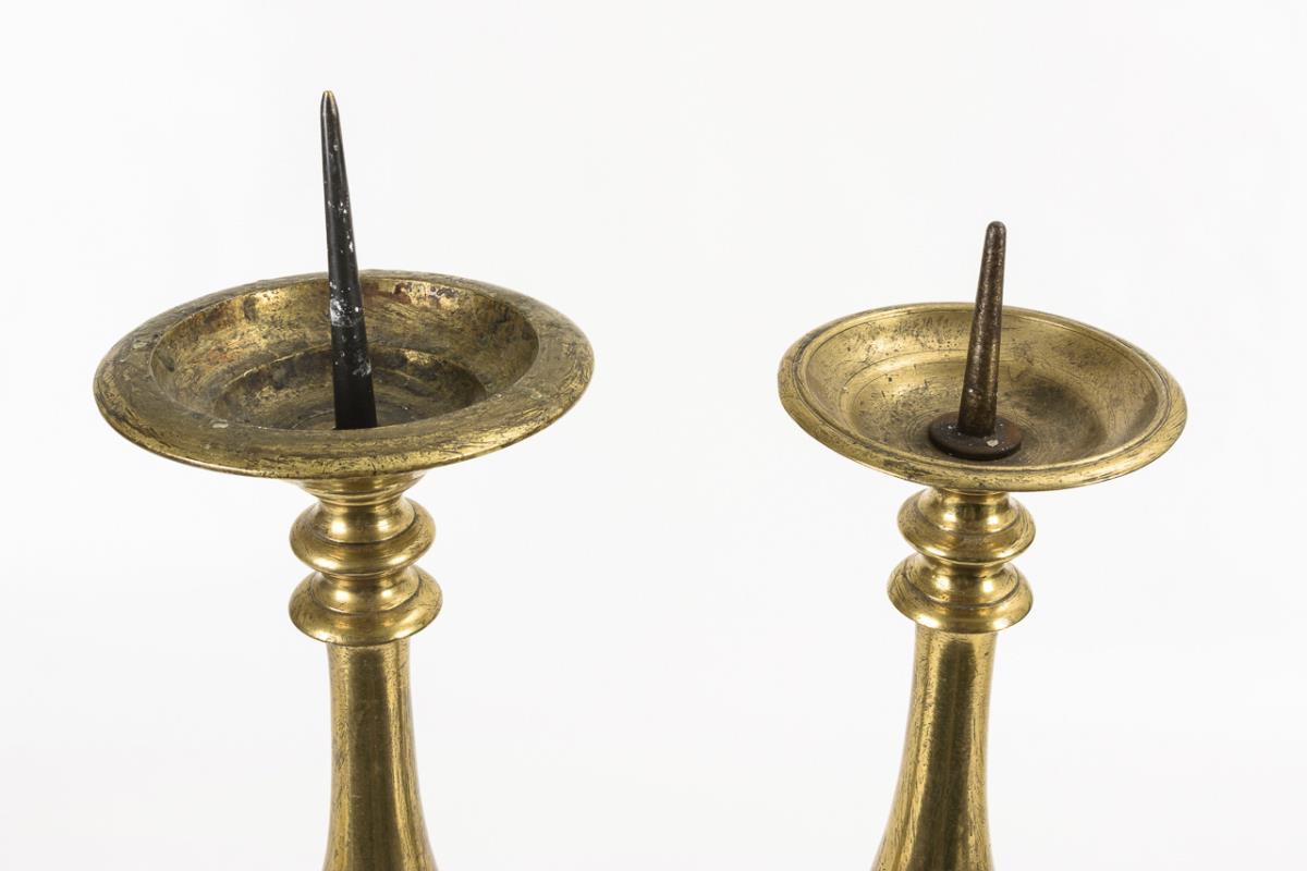 Massiv gegossene Kerzenleuchter mit 3-seitigem Sockel auf Tatzen-Kugel-Füßen sowie Balusterschaft. Fehlende Sockel-Applikationen, 1 Wachsteller und 1 Dorn ergänzt, 1 Schaftschraube erneuert.