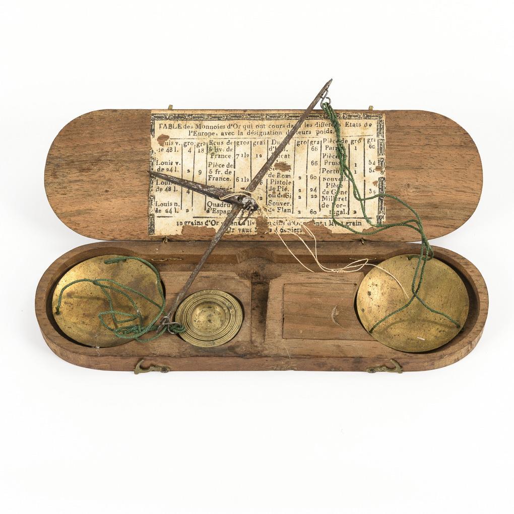 Balkenwaage, drei Trichtergewichte (unvollständig) und in einem Schub 5 Feingewichte. Im Deckel gedruckte Gewichtstabelle.