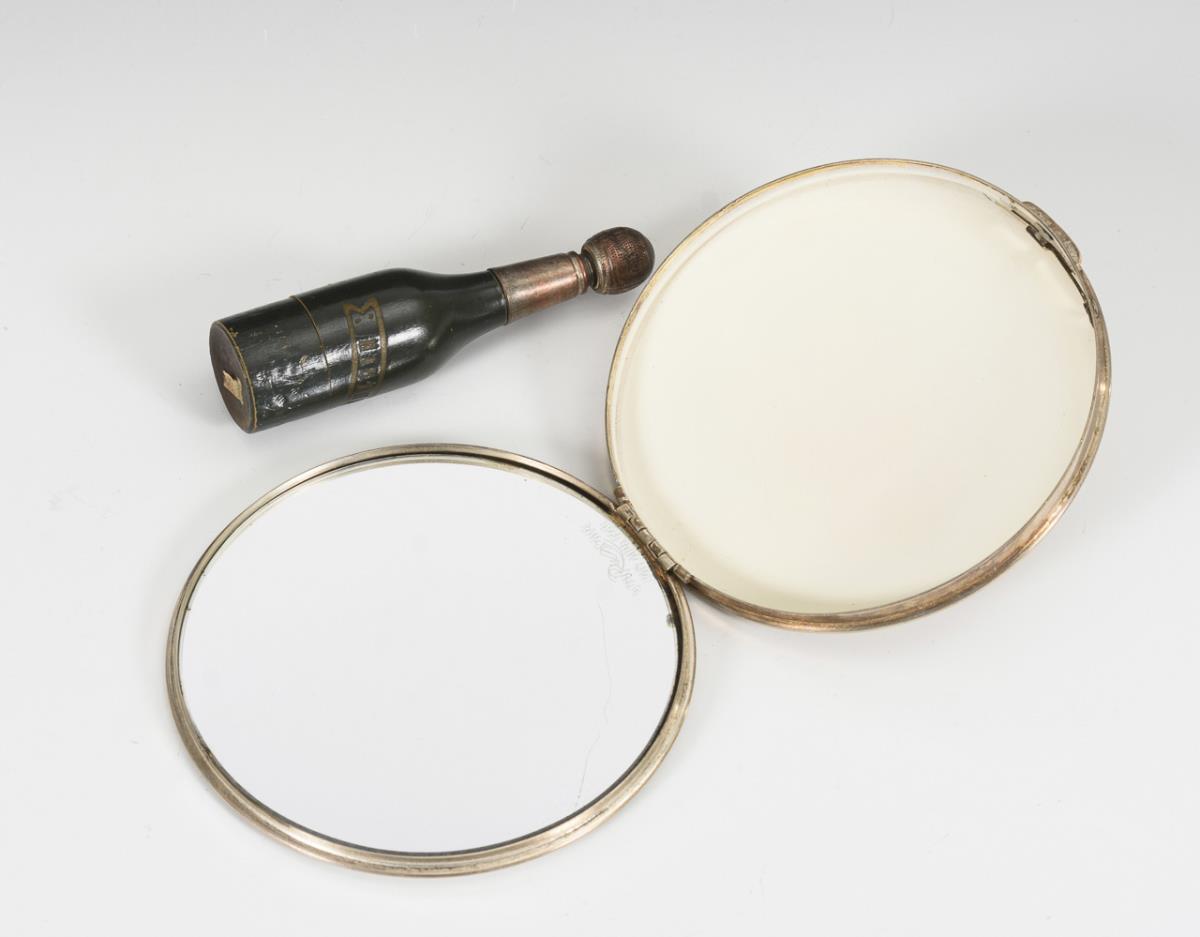 Floral gravierte Puderdose mit Innenspiegel und festem Puderrest. Auf dem Spiegelglas bezeichnet: "Rex 5th Ave." / Aufschraubbare Holzflasche mit kleinem Metall-Fingerhut im Innern. Alters- und Gebrauchsspuren.