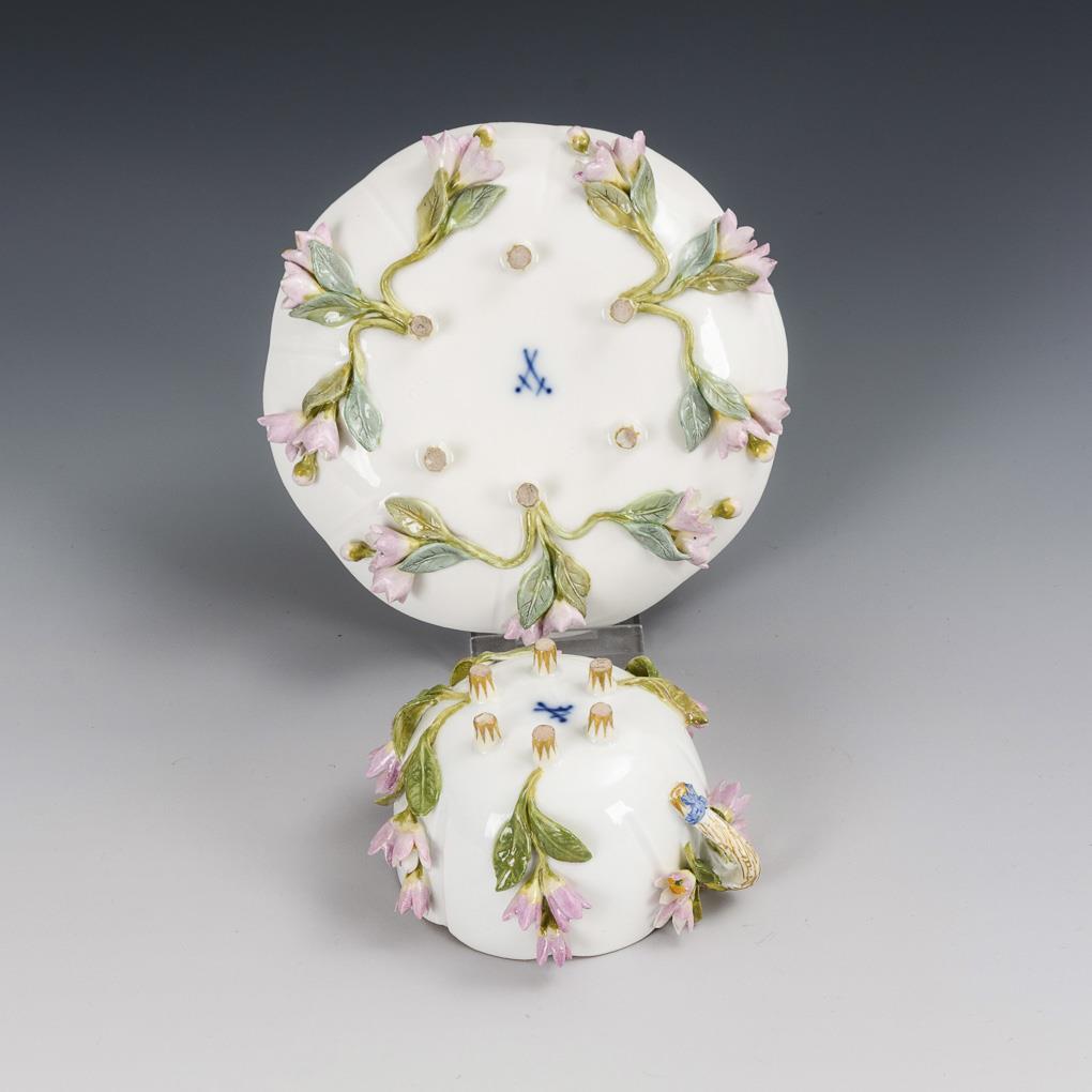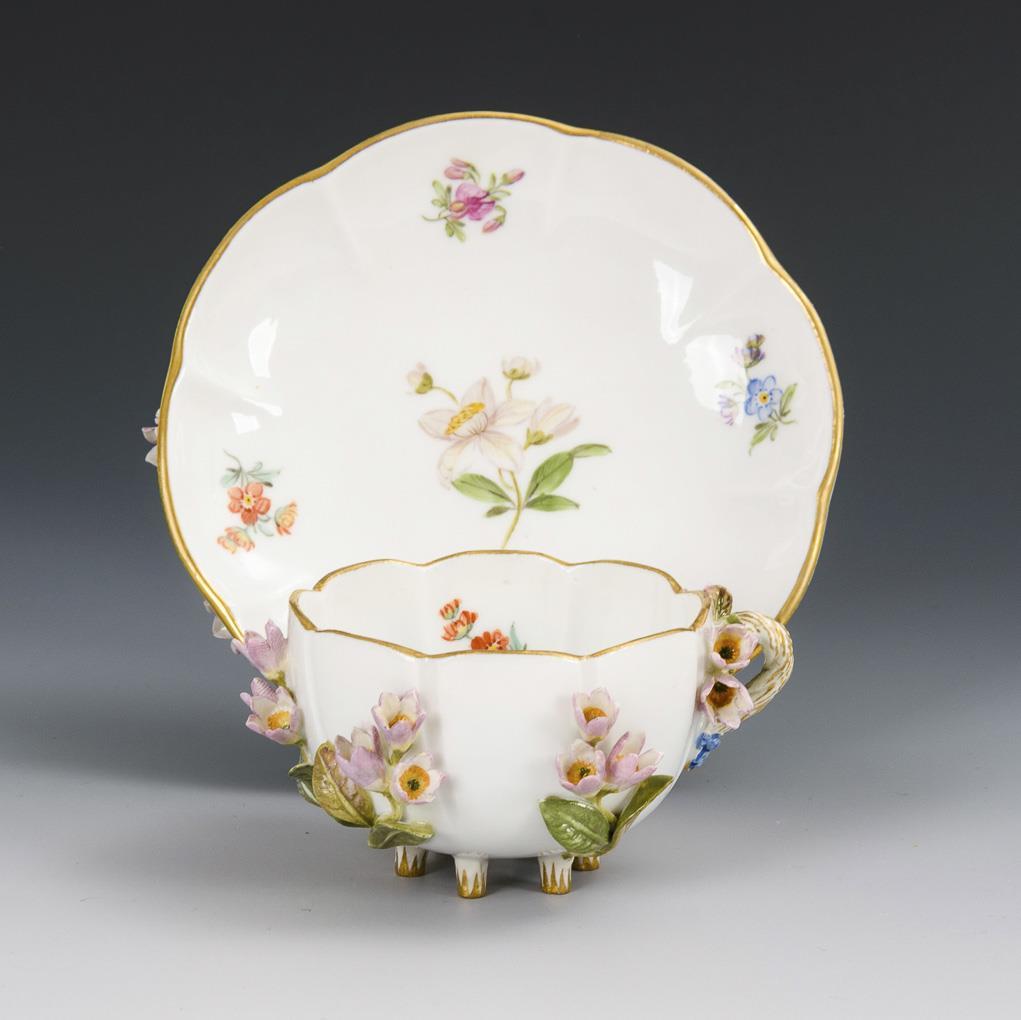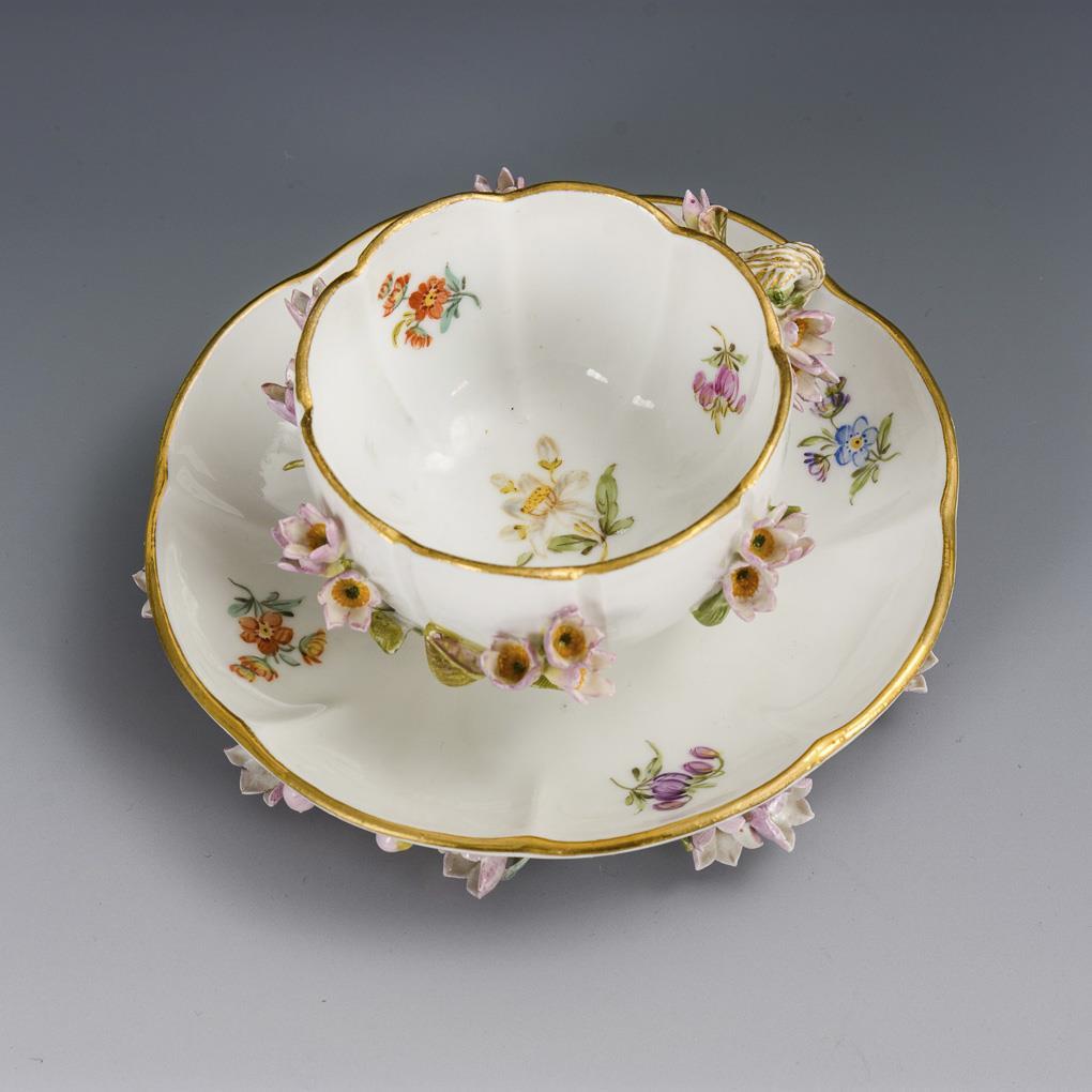 Tasse und Untertasse mit Blütenbelag. Meissen.