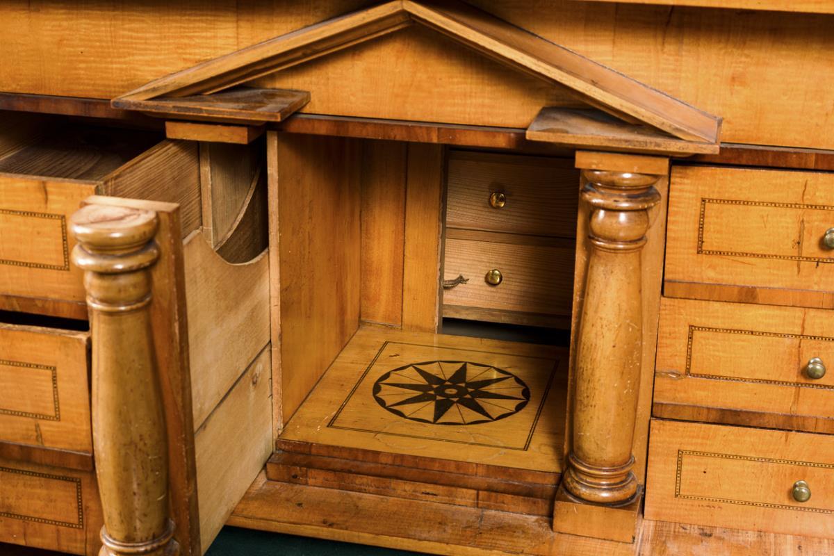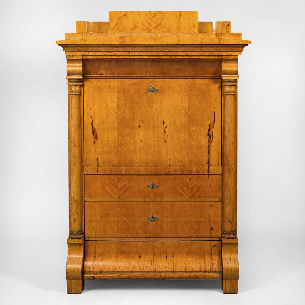 Schreibschrank mit aufklappbarer Schreibplatte und getrepptem Kopfteil mit seitlichen Volutenblenden und versteckten Schüben, kommodenförmiges Unterteil mit verstecktem Sockelschub; innen mit architektonisch verziertem Mittelfach, 6 kleinen Schüben, zahlreichen Geheimfächern und herausziehbarer Schreibplatte. Restauriert, Alters-/Gebrauchsspuren, Furnier mit Trockenrissen und kleinen Defekten.