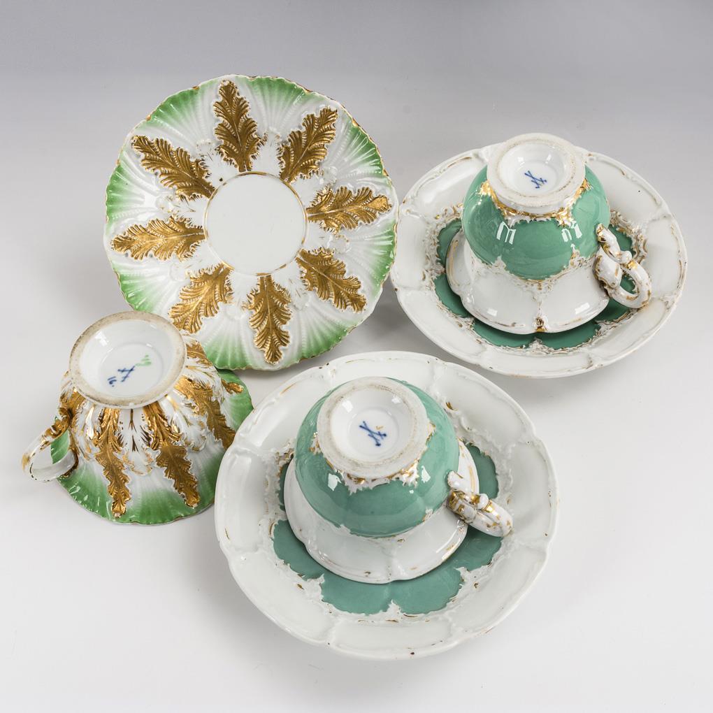 3 Tassen Meissen: 1 Relieftasse und 2 Tassen "B-Form" (H Tassen 7,5 cm, Ø originale Untertassen 16 cm), 2 Ziervasen Conta & Böhme (H ca. 15 cm), 1 Vase mit dunkelgrünem Fond (H 21 cm), 1 Teedose (H 15 cm) und 1 figürliche Menage (H 14 cm). Partieller Goldabrieb, 1 Ziervase mit Randbestoßung, 1 Ziervase mit bestoßenem Blatt, Relieftasse mit Randbestoßung und 2 Haarrissen.