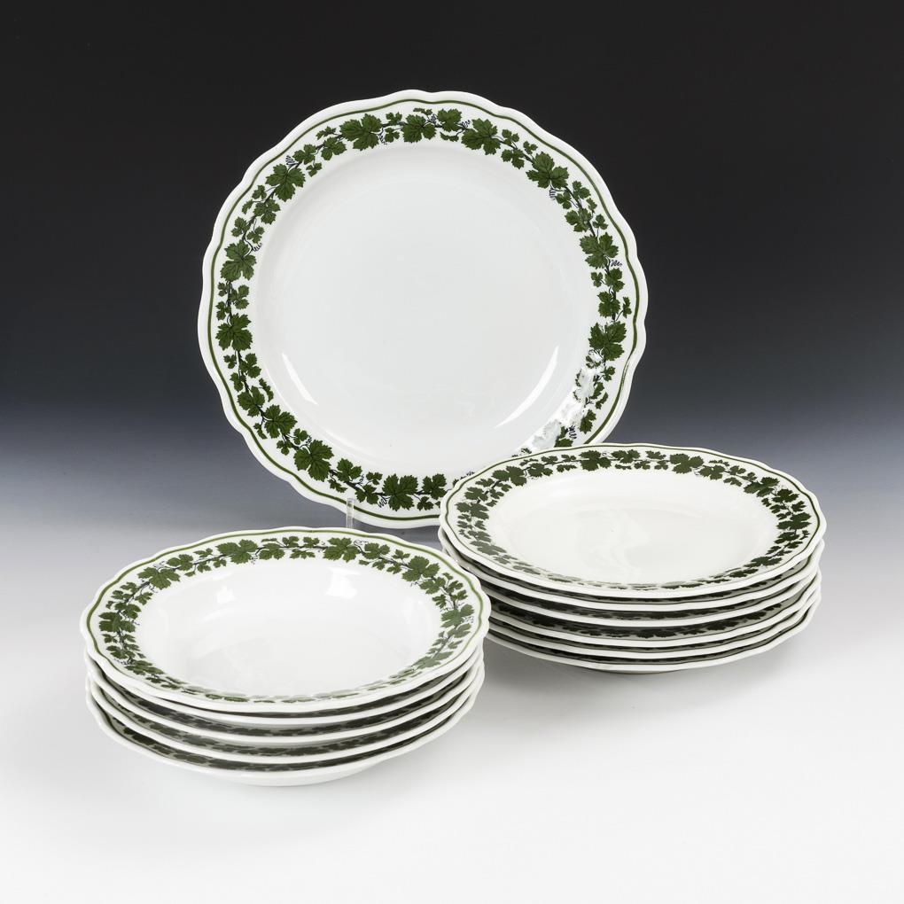 Unterglasurgrüne Malerei. 6 Speiseteller (Ø 25,5 cm), 5 Suppenteller (Ø 23,5 cm), 1 Gemüseteller (Ø 32 cm).