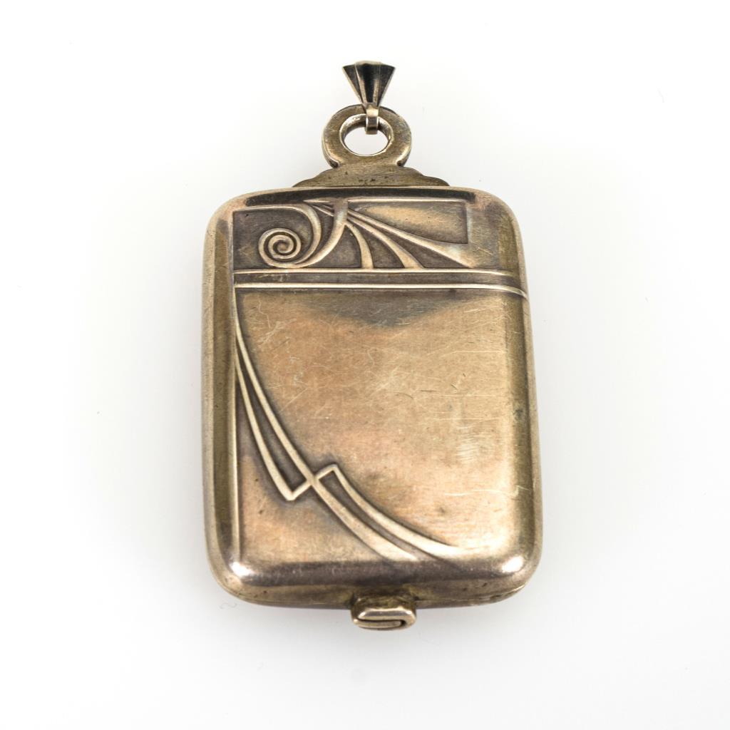 Beidseitig stiltypisch reliefiertes, aufschiebbares Medaillon mit gerahmt verglastem Innenfach und eingelegtem Spiegel. Rückseitige Gravur partiell entfernt.